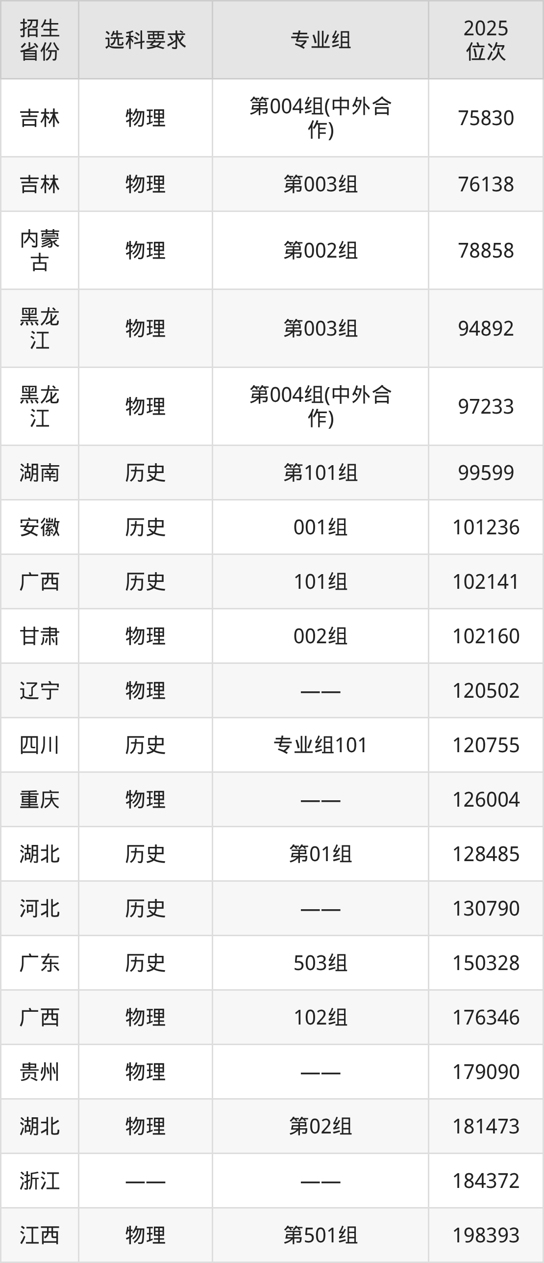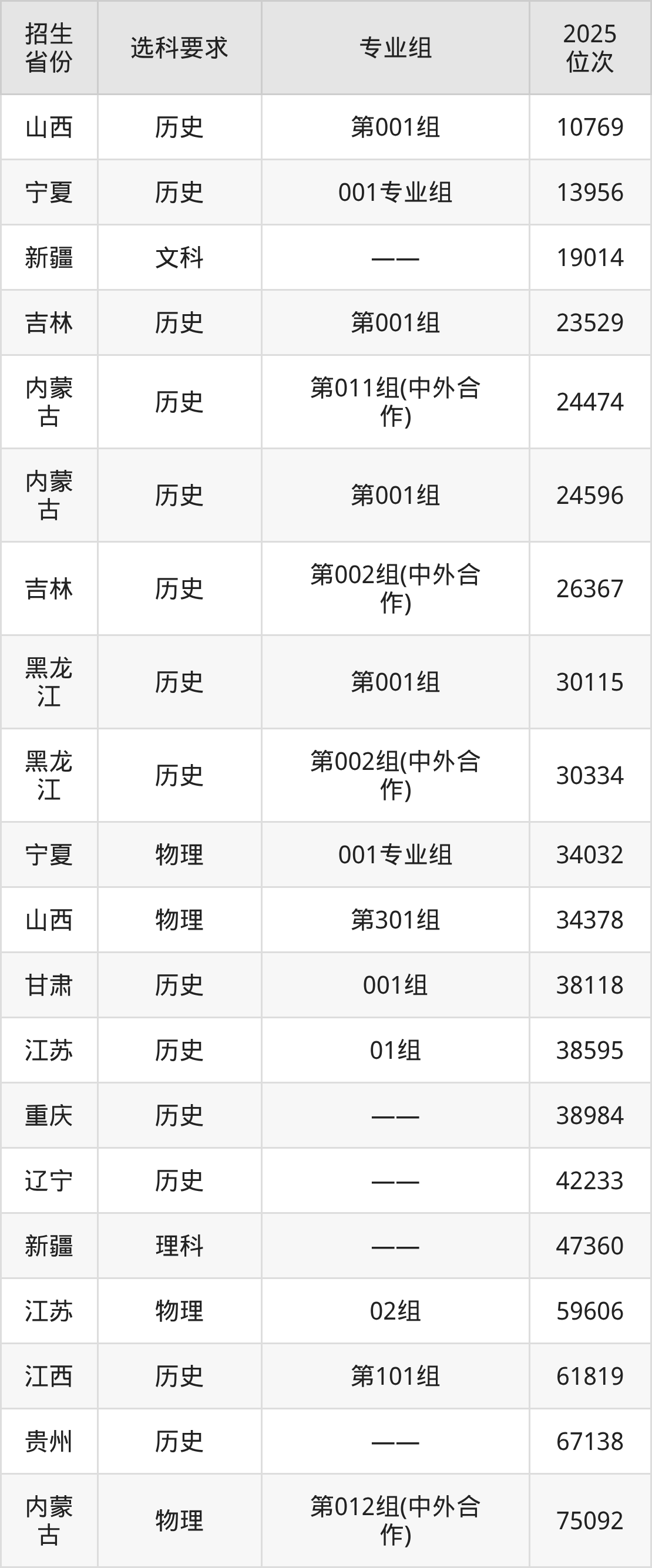 长春金融高等专科学校2025年在全国各省的位次差异较大,最高位次是10769位(山西历史类)、最低位次是439958位(山东)。各省具体位次请看下图:
