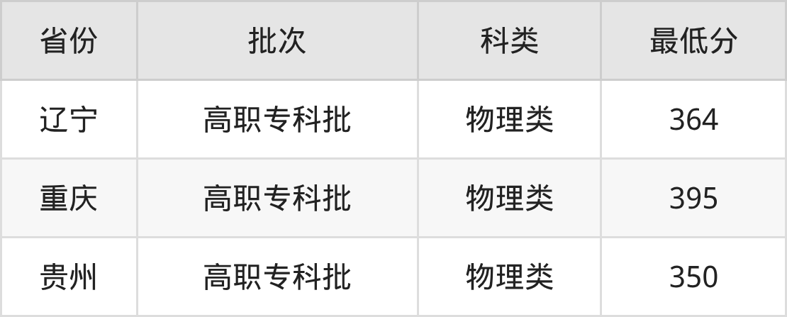 2025年贵州航空职业技术学院智能焊接技术专业在贵州省内专科招物理类考生,最低分为350分(物),超专科线170分,考生最低录取位次为181376名。下面是专业分数详情: