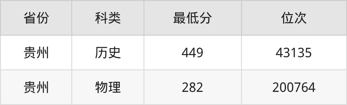 2025年桂林旅游学院应用泰语专业在贵州录取最低分:历史组是449分,对应位次排名是43135名;物理组是282分,对应位次排名是200764名。
