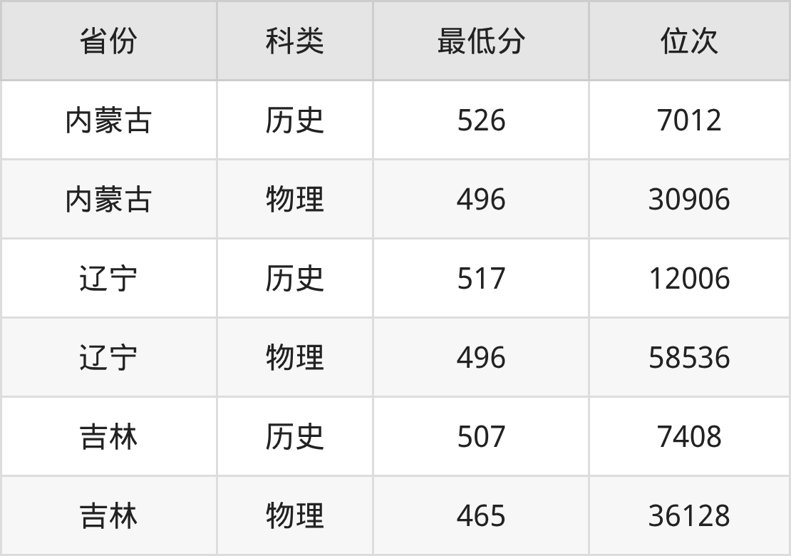 2025年大连民族大学少数民族预科专业在内蒙古录取最低分:历史组是526分,对应位次排名是7012名;物理组是496分,对应位次排名是30906名。