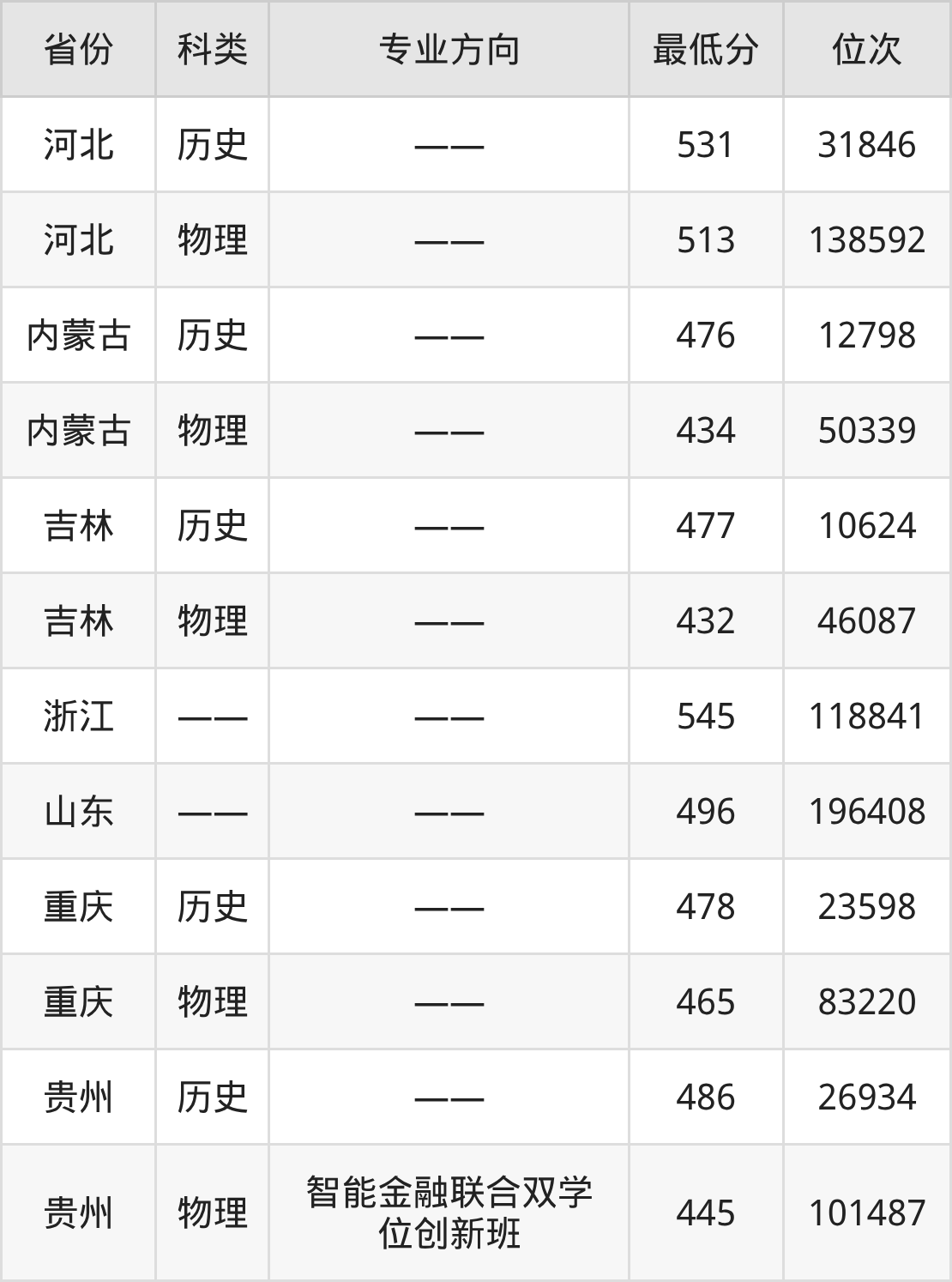 2025年西南财经大学天府学院金融学专业在贵州录取最低分:历史组是486分,对应位次排名是26934名;物理组是445分,对应位次排名是101487名。