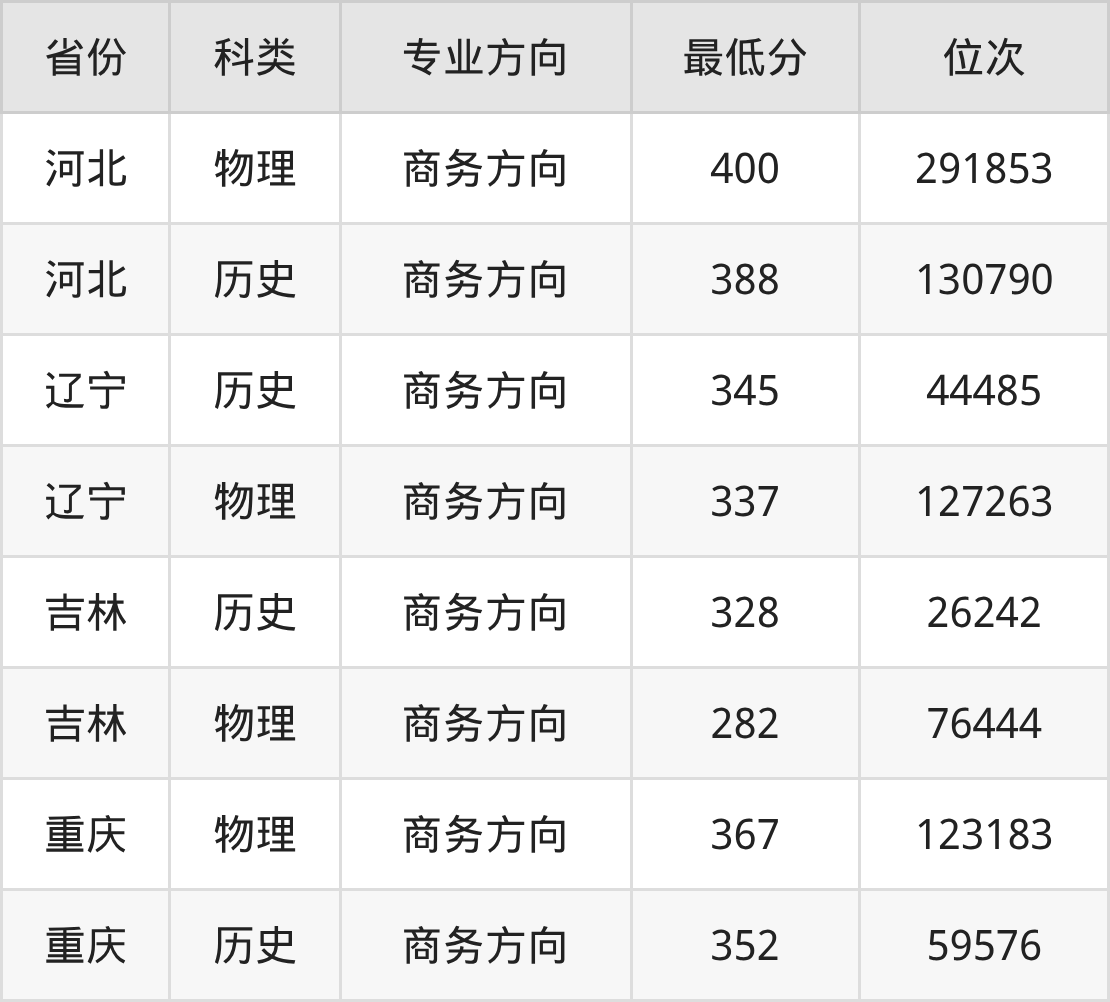 2025年河北对外经贸职业学院应用韩语专业在河北录取最低分:物理组是400分,对应位次排名是291853名;历史组是388分,对应位次排名是130790名。