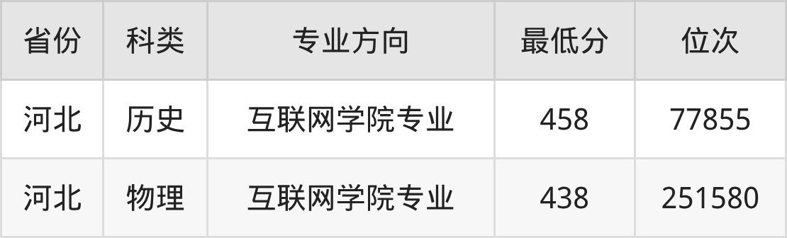 2025年河北工业职业技术大学大数据技术专业在河北录取最低分:历史组是458分,对应位次排名是77855名;物理组是438分,对应位次排名是251580名。