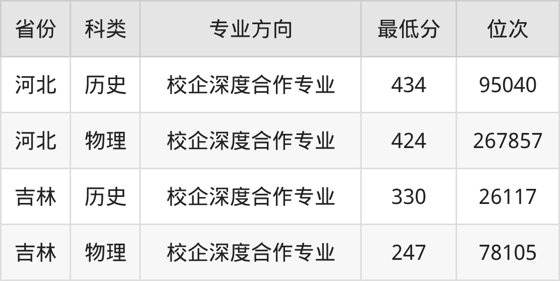 2025年河北对外经贸职业学院人工智能技术应用专业在吉林录取最低分:历史组是330分,对应位次排名是26117名;物理组是247分,对应位次排名是78105名。
