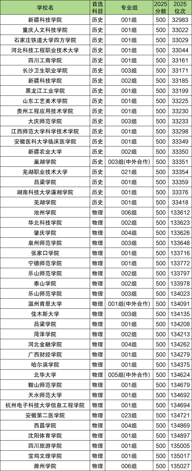 安徽历史类500分位次是32983名~33418名,2025年该分数位次对应的大学有新疆科技学院001组、四川工商学院001组、大庆师范学院003组、芜湖学院001组等,具体名单如下表所示: