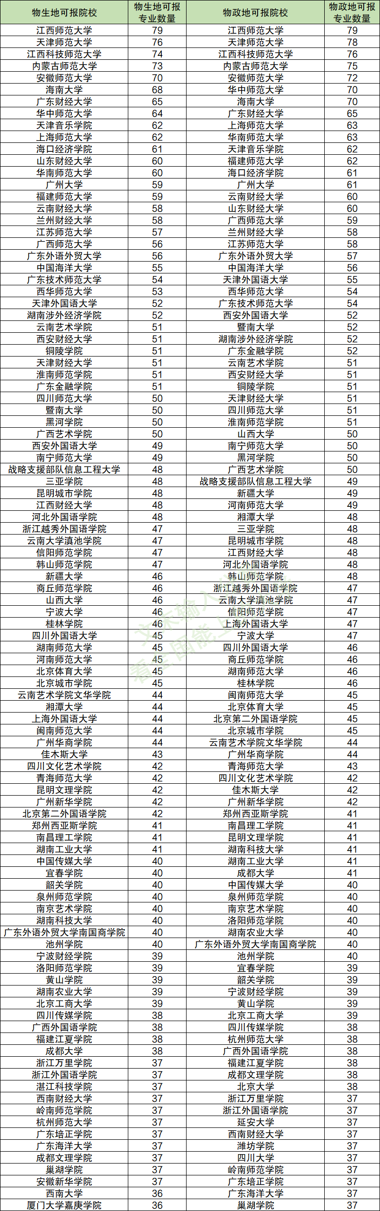 如江西科技师范大学物生地可报74个专业,物政地能报76个专业;安徽师范大学物生地可报70个专业,物政地可报72个专业;广州大学物生地可报59个专业,物政地可报61个专业等。