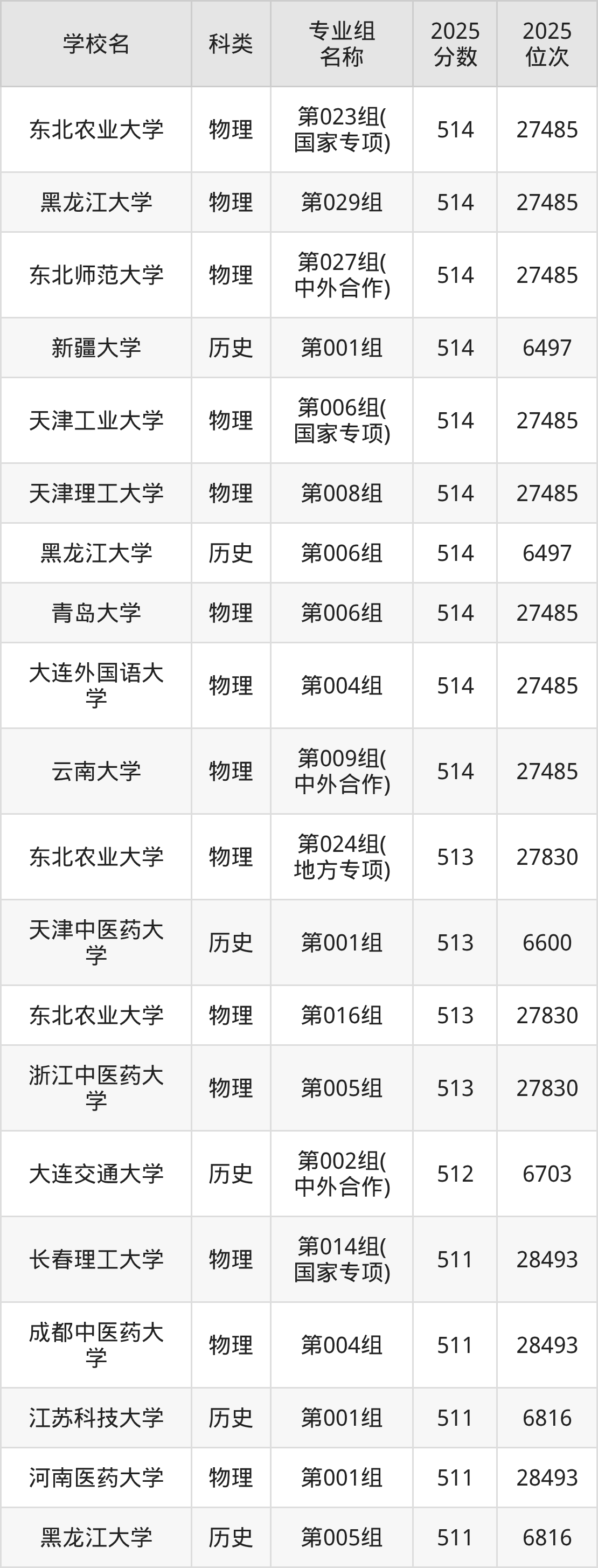 以黑龙江物理类为例,514分能上的一本大学有东北农业大学(位次排名27830名)、长春理工大学(位次排名43011名)、成都理工大学(位次排名29150名)。