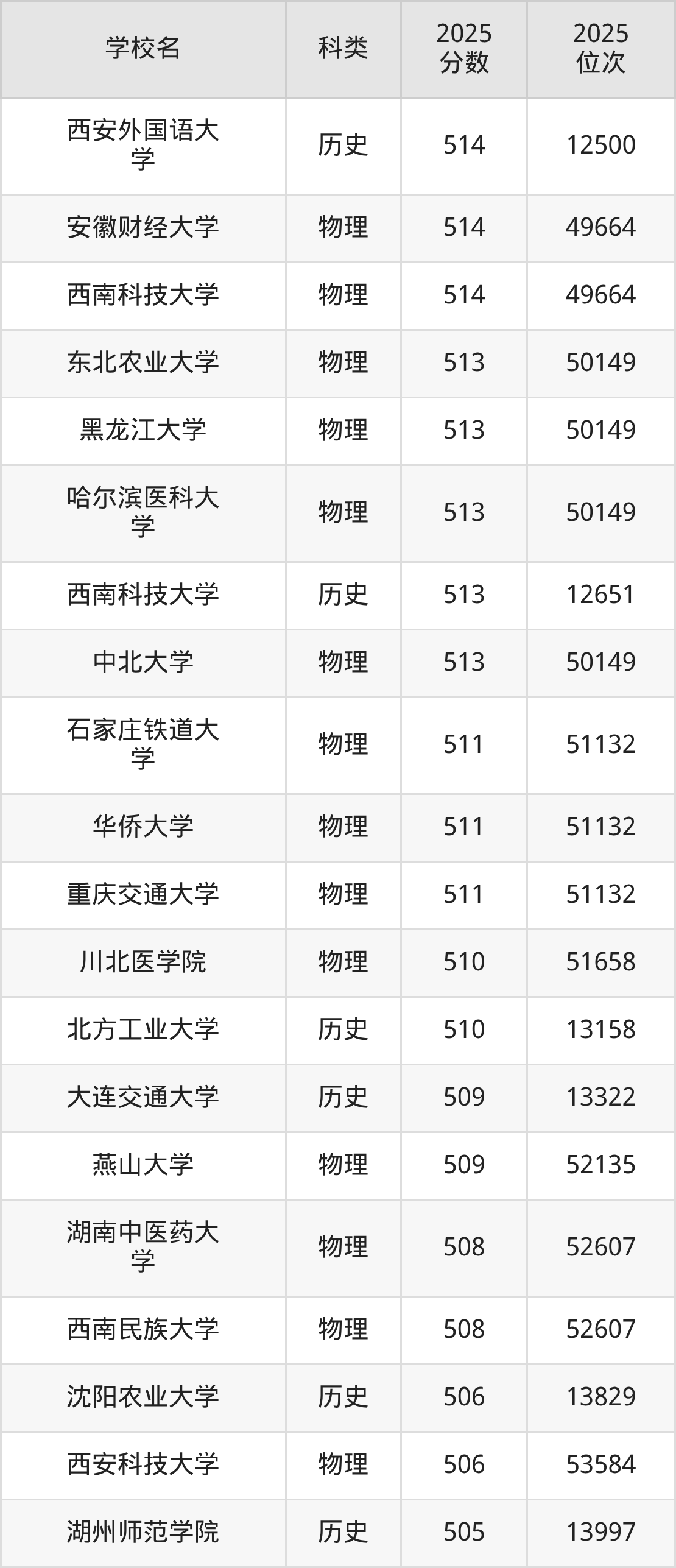 2025年黑龙江历史类本科线为405分,514分能上的一本大学共计47所,其中公办大学录取位次排名最低的是湖南科技大学(第001组405分),其2025最低位次为22977名。