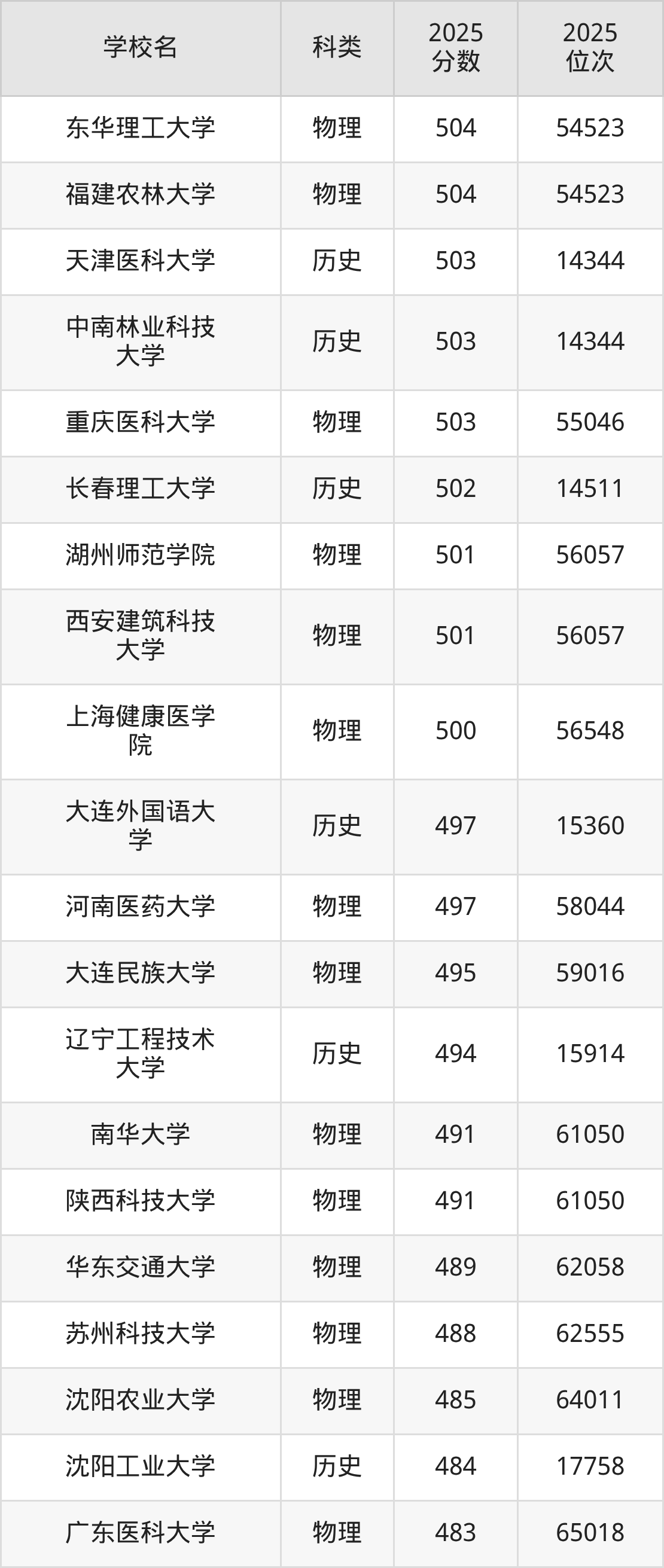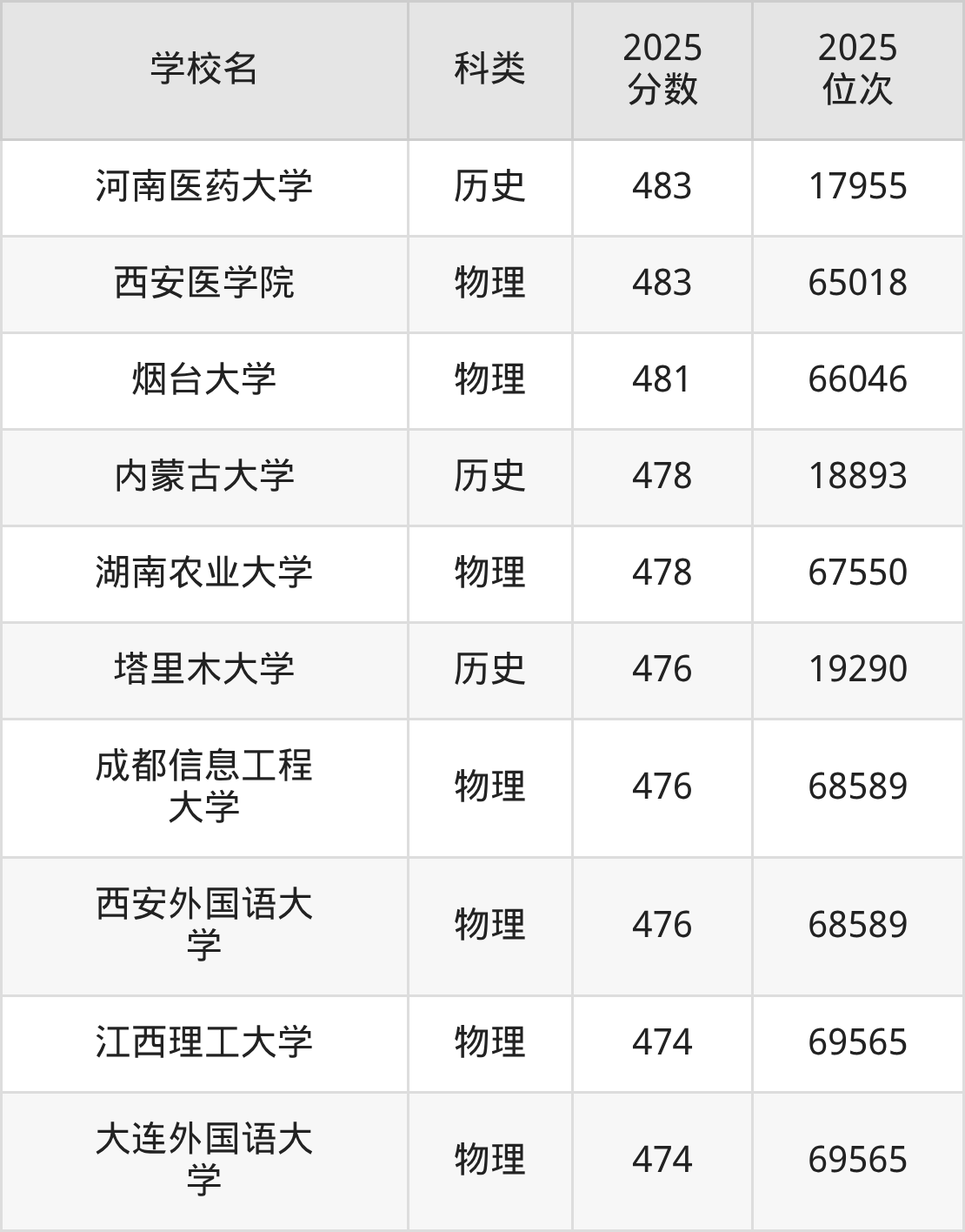 而民办大学录取位次排名最低的是宁波诺丁汉大学(481分),其2025最低位次为10495名。