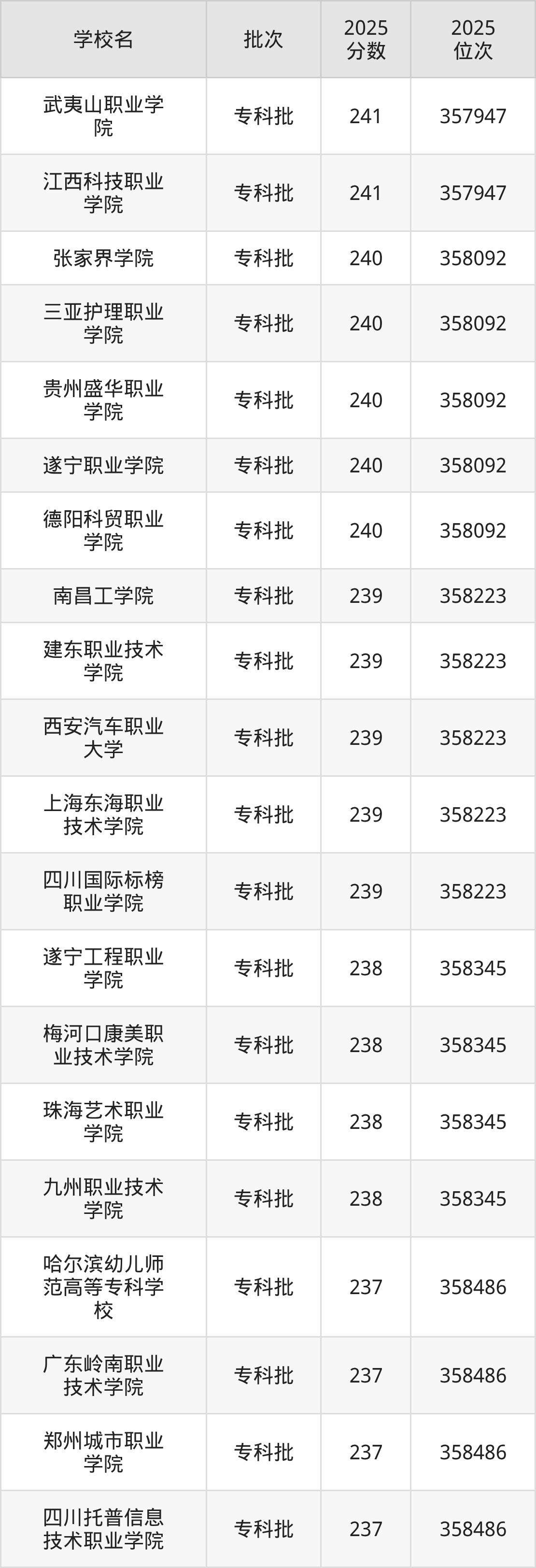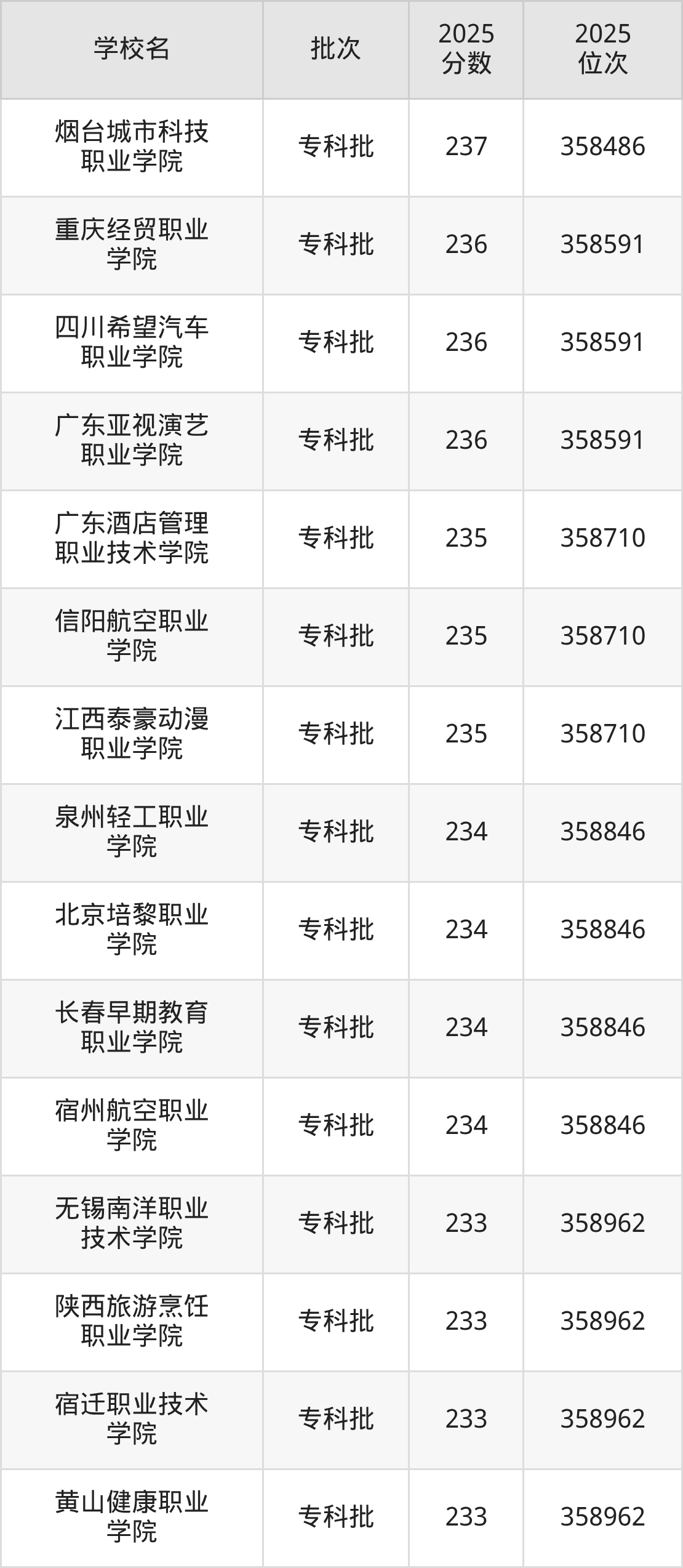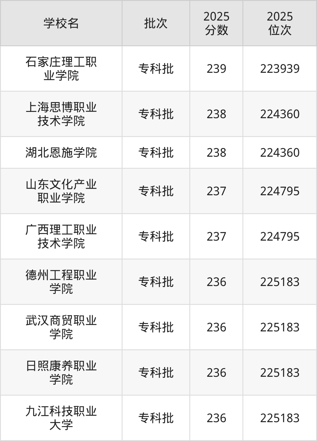 2025年河北高考历史类237分(224361名~224795名)能上的大学有山东文化产业职业学院、广西理工职业技术学院。