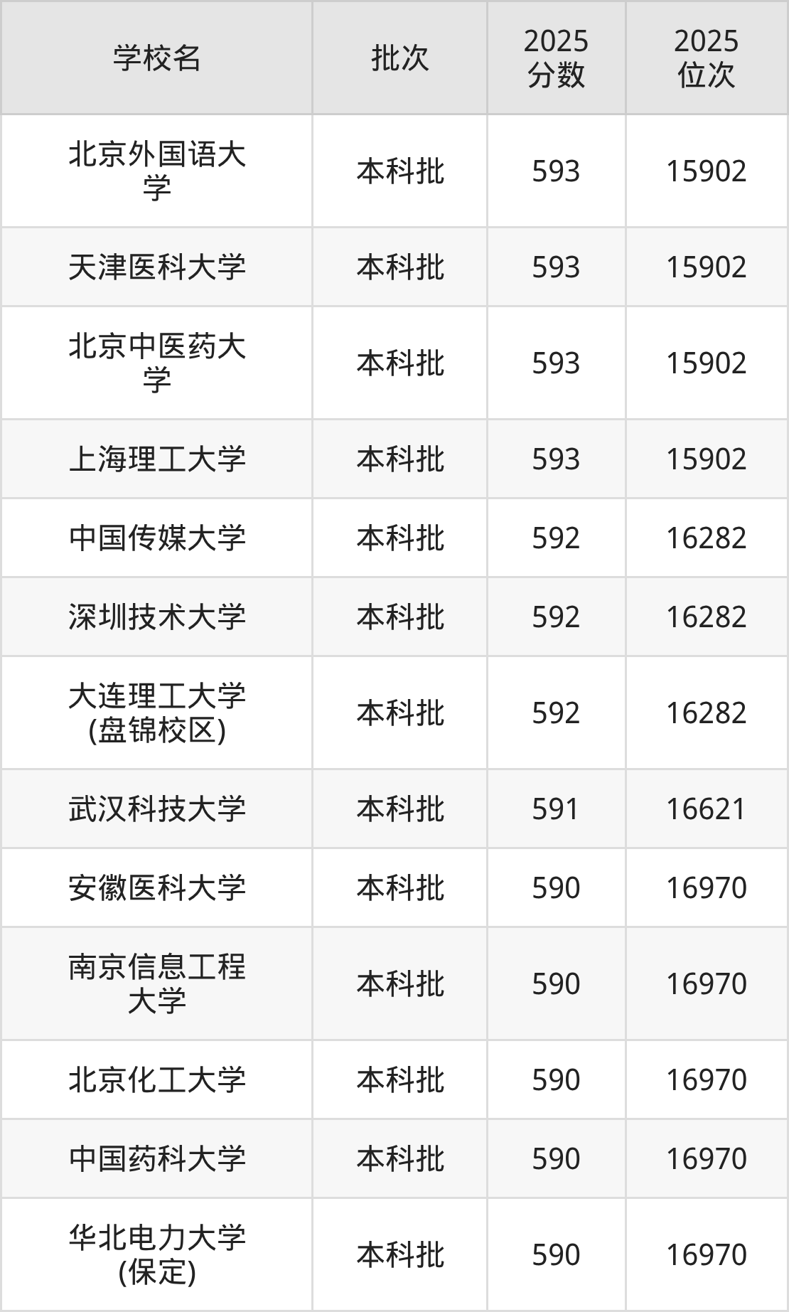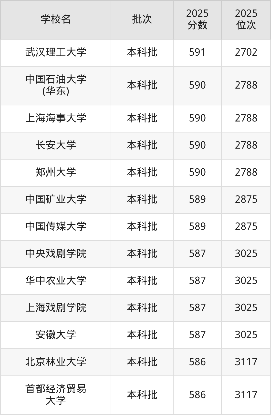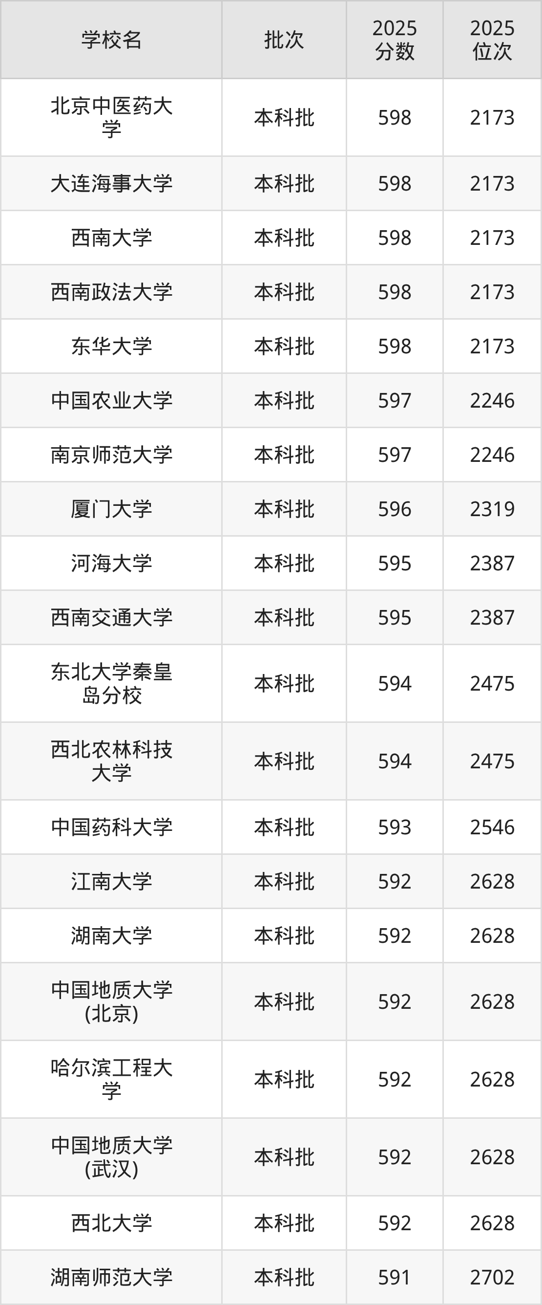 2025年辽宁高考历史类591分(2629名~2702名)能上的大学有湖南师范大学、武汉理工大学。