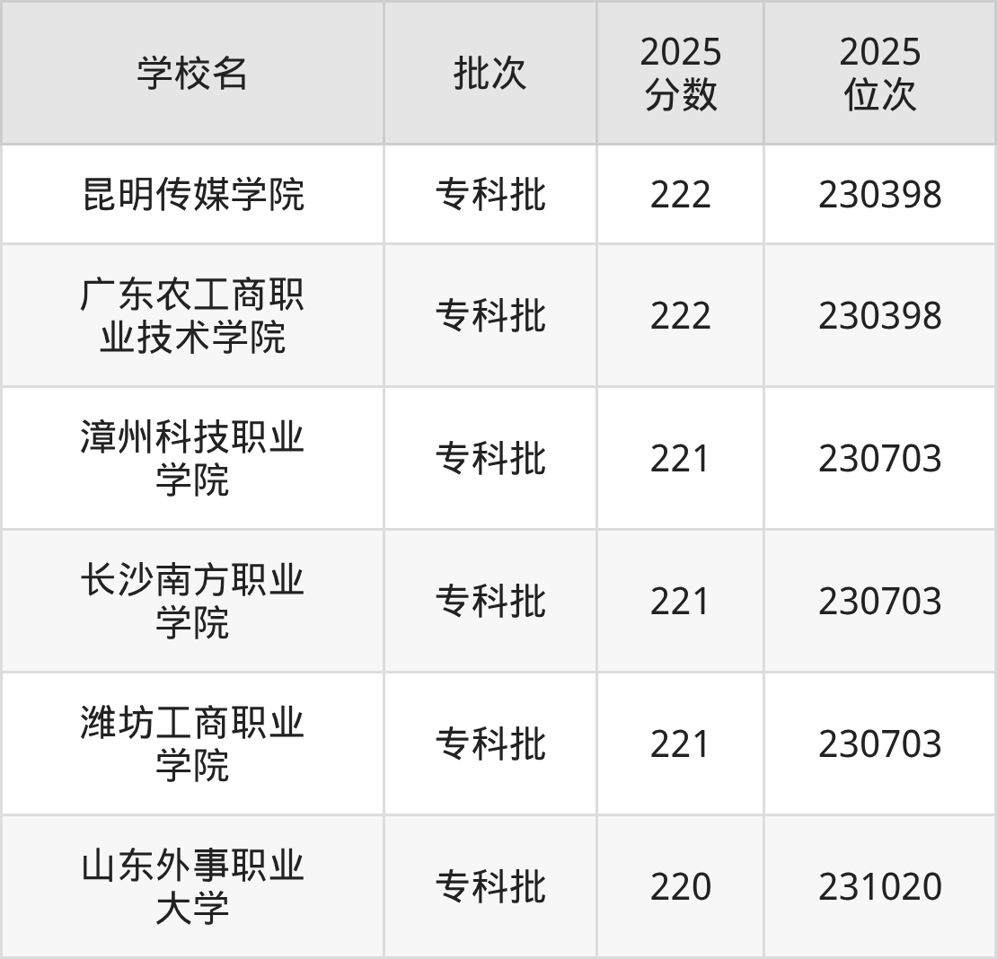 2025年河北高考历史类221分(230399名~230703名)能上的大学有潍坊工商职业学院、长沙南方职业学院、漳州科技职业学院。