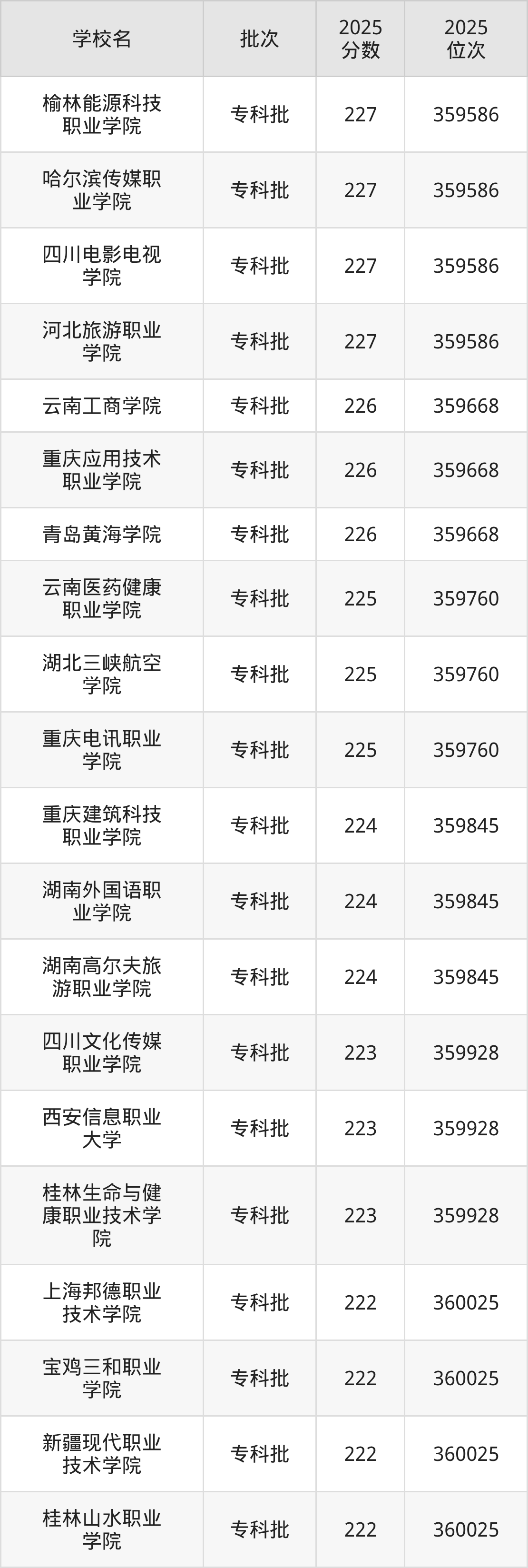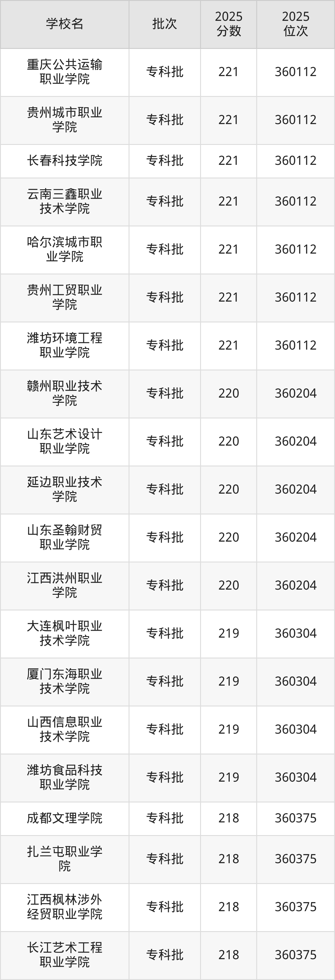 2025年河北高考物理类221分(360026名~360112名)能上的大学有长春科技学院、重庆公共运输职业学院、云南三鑫职业技术学院、哈尔滨城市职业学院等。