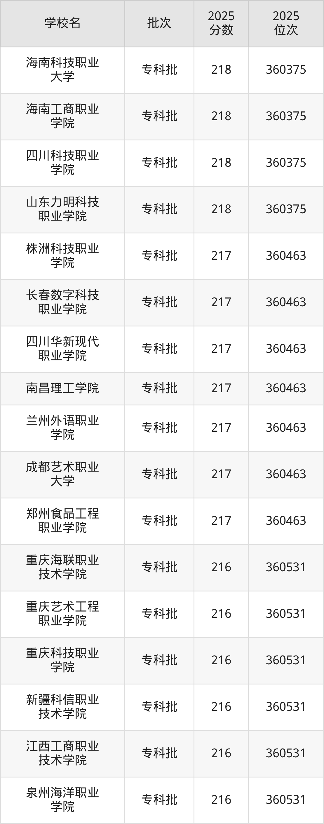 另外录取位次低于该区间(较稳妥)的有延边职业技术学院(360204名)、山东圣翰财贸职业学院(360204名)等;录取位次高于该区间(可冲)的有宝鸡三和职业学院(360025名)、桂林山水职业学院(360025名)等。