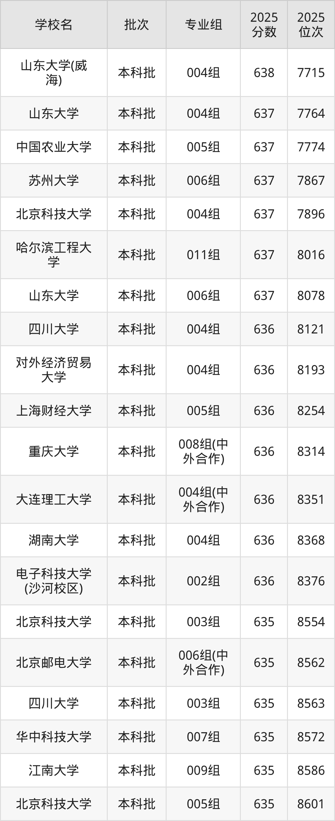 另外录取位次低于该区间(较稳妥)的有北京科技大学003组(8554名)、北京邮电大学006组(中外合作)(8562名)等;录取位次高于该区间(可冲)的有山东大学006组(8078名)、哈尔滨工程大学011组(8016名)等。
