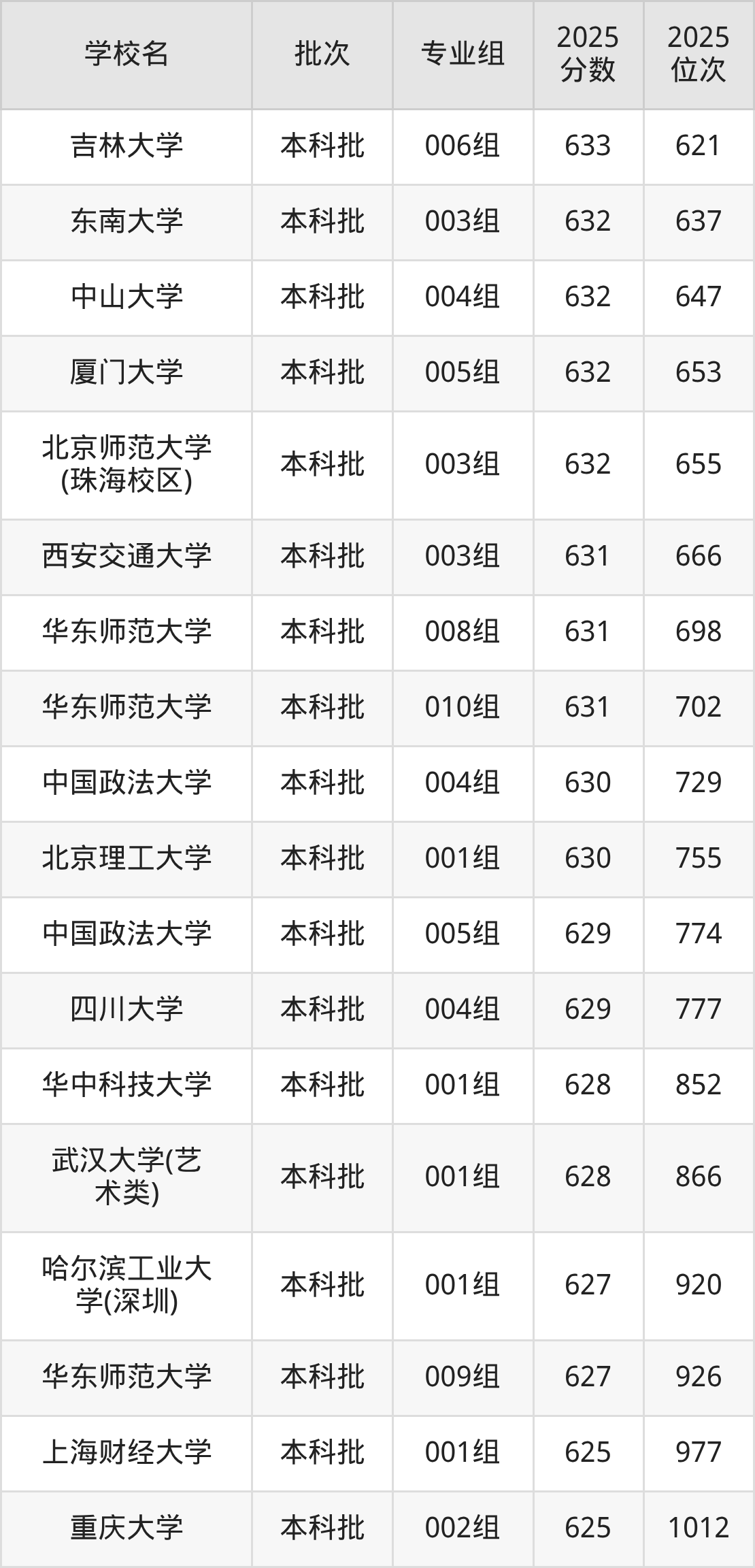 另外录取位次低于该区间(较稳妥)的有厦门大学004组(555名)、东南大学002组(593名)等;录取位次高于该区间(可冲)的有北京航空航天大学001组(444名)、南开大学004组(431名)等。