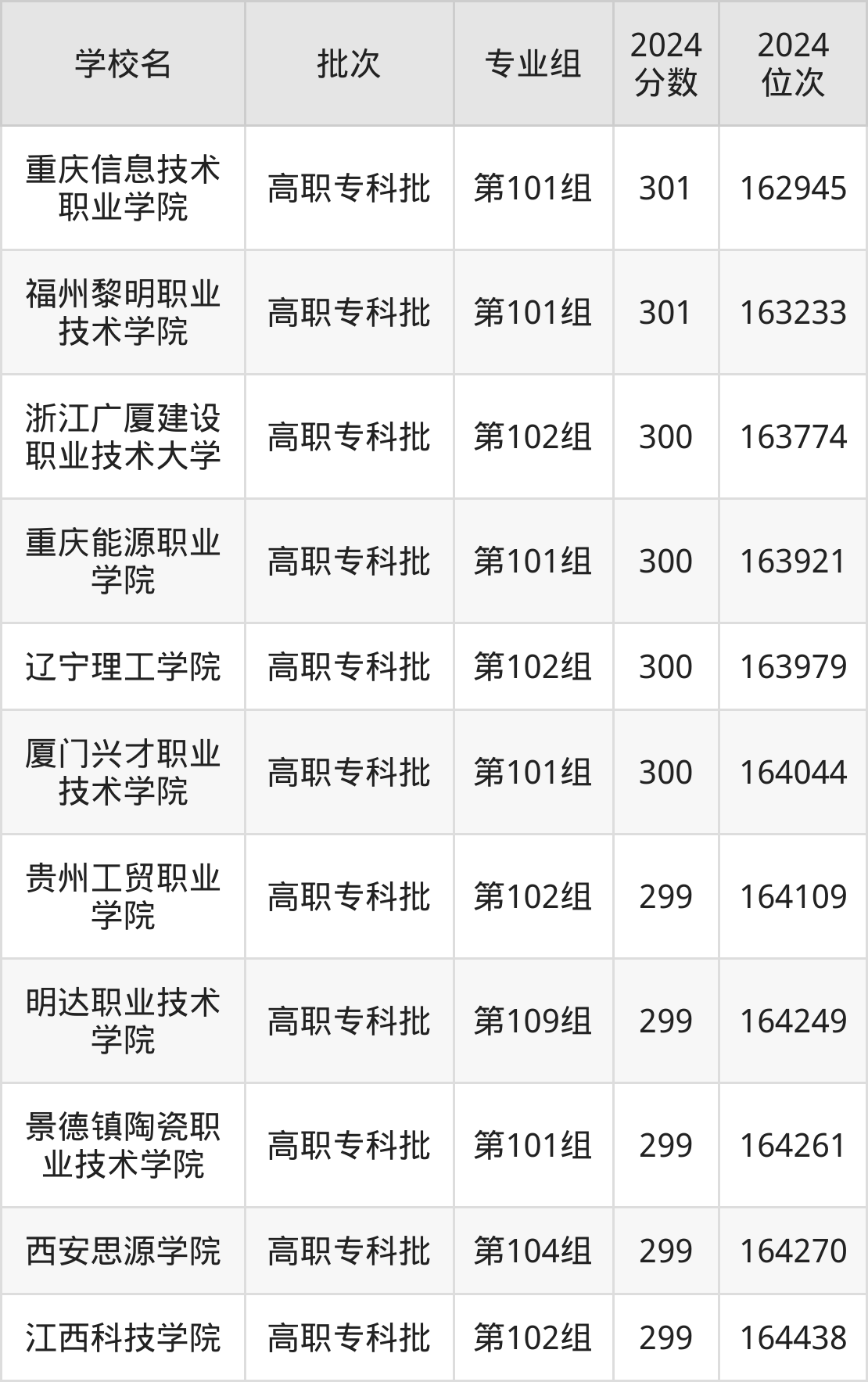 2024年江西高考历史类300分(163433名~164086名)能上的大学有辽宁理工学院第102组、浙江广厦建设职业技术大学第102组、厦门兴才职业技术学院第101组、重庆能源职业学院第101组。