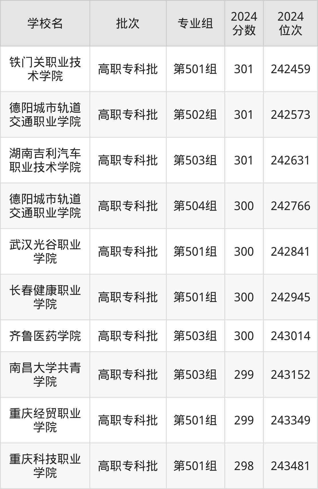 2024年江西高考物理类300分(242713名~243061名)能上的大学有长春健康职业学院第501组、齐鲁医药学院第503组、武汉光谷职业学院第501组、德阳城市轨道交通职业学院第504组。