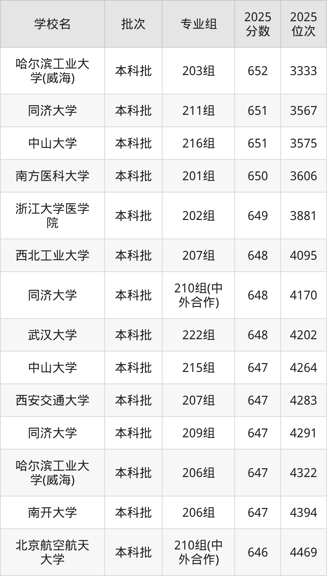 另外录取位次低于该区间(较稳妥)的有西北工业大学207组(4095名)、同济大学210组(中外合作)(4170名)等;录取位次高于该区间(可冲)的有南方医科大学201组(3606名)、中山大学216组(3575名)等。