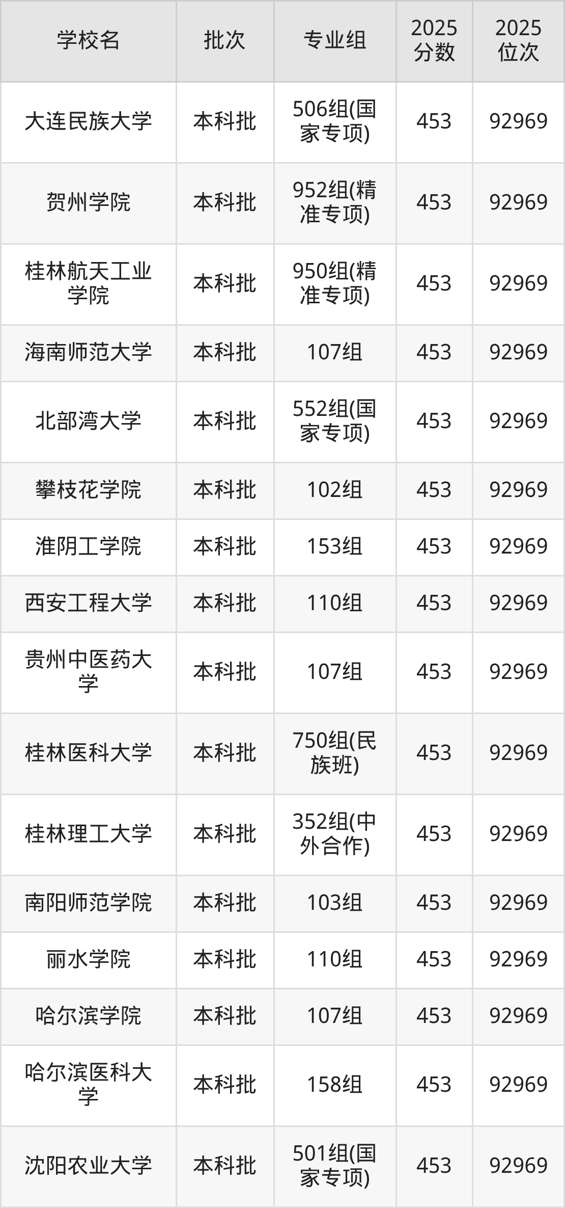 2025年广西高考物理类453分(92077名~92969名)能上的大学有沈阳农业大学501组(国家专项)、哈尔滨医科大学158组、哈尔滨学院107组、丽水学院110组等。