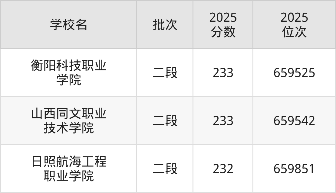 2025年山东高考233分(659205名~659792名)能上的大学有山西同文职业技术学院、衡阳科技职业学院。