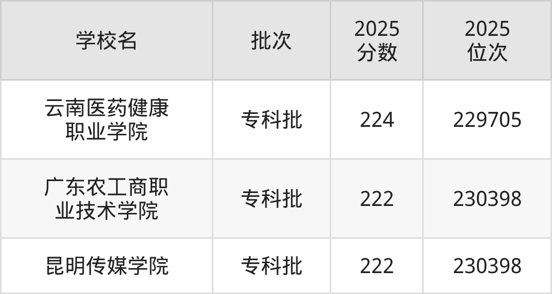 2025年河北高考历史类223分(229706名~230046名)录取位次低于该区间(较稳妥)的有昆明传媒学院(230398名)、广东农工商职业技术学院(230398名)等;录取位次高于该区间(可冲)的有云南医药健康职业学院(229705名)、长春师范高等专科学校(228917名)等。