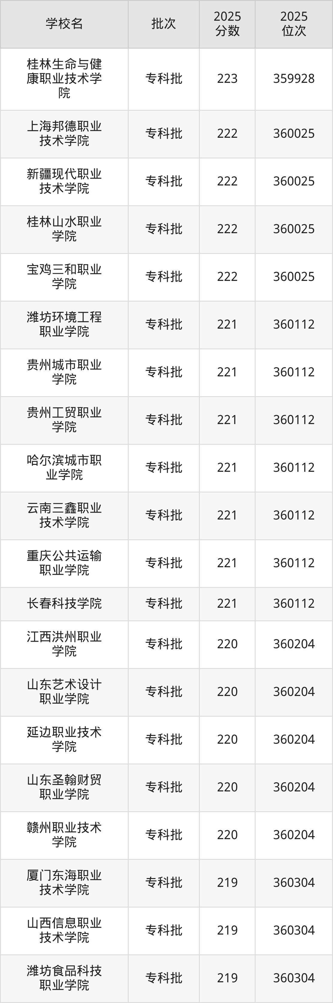 2025年河北高考物理类223分(359846名~359928名)能上的大学有桂林生命与健康职业技术学院、四川文化传媒职业学院、西安信息职业大学。