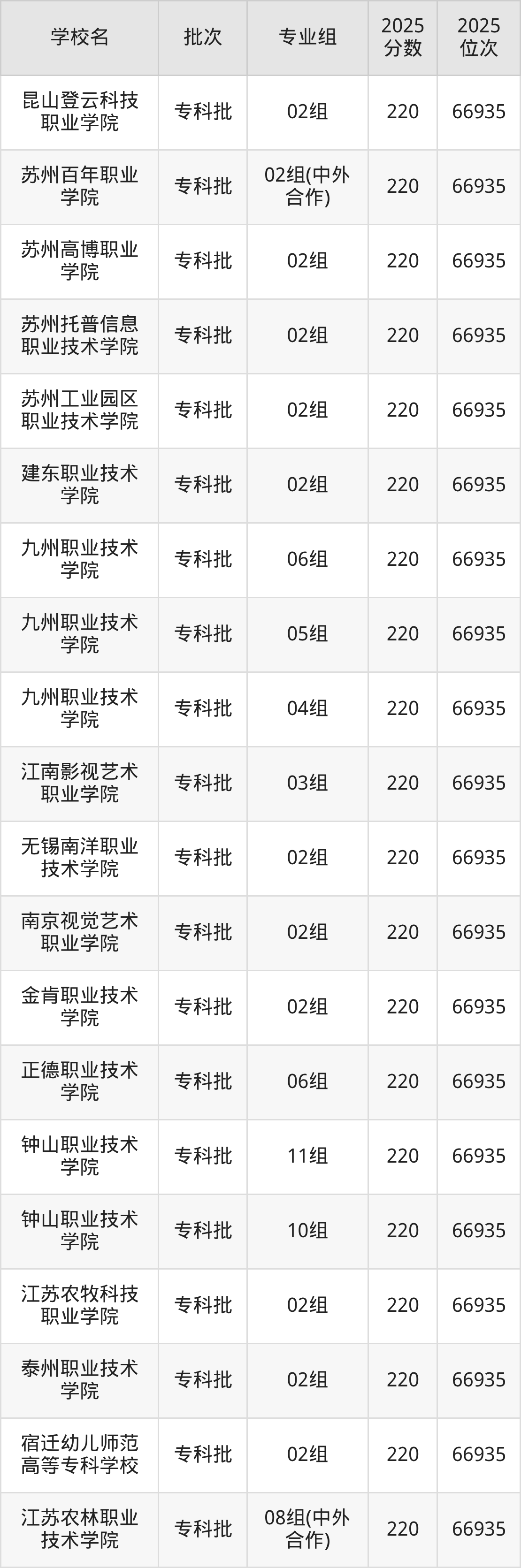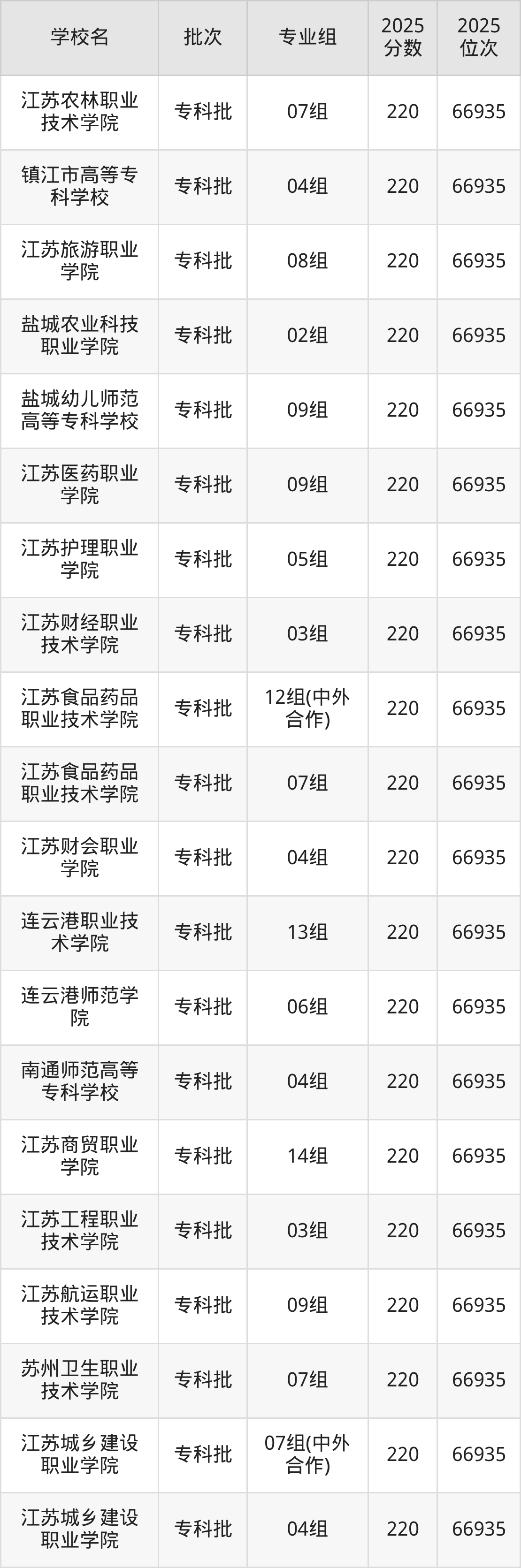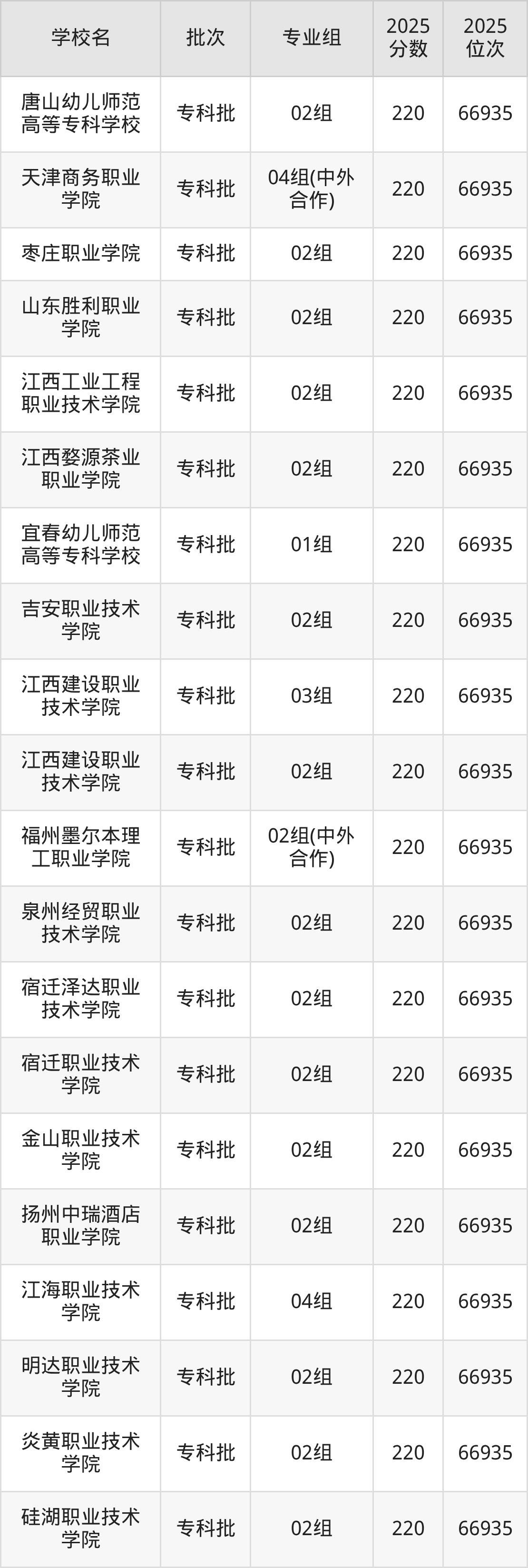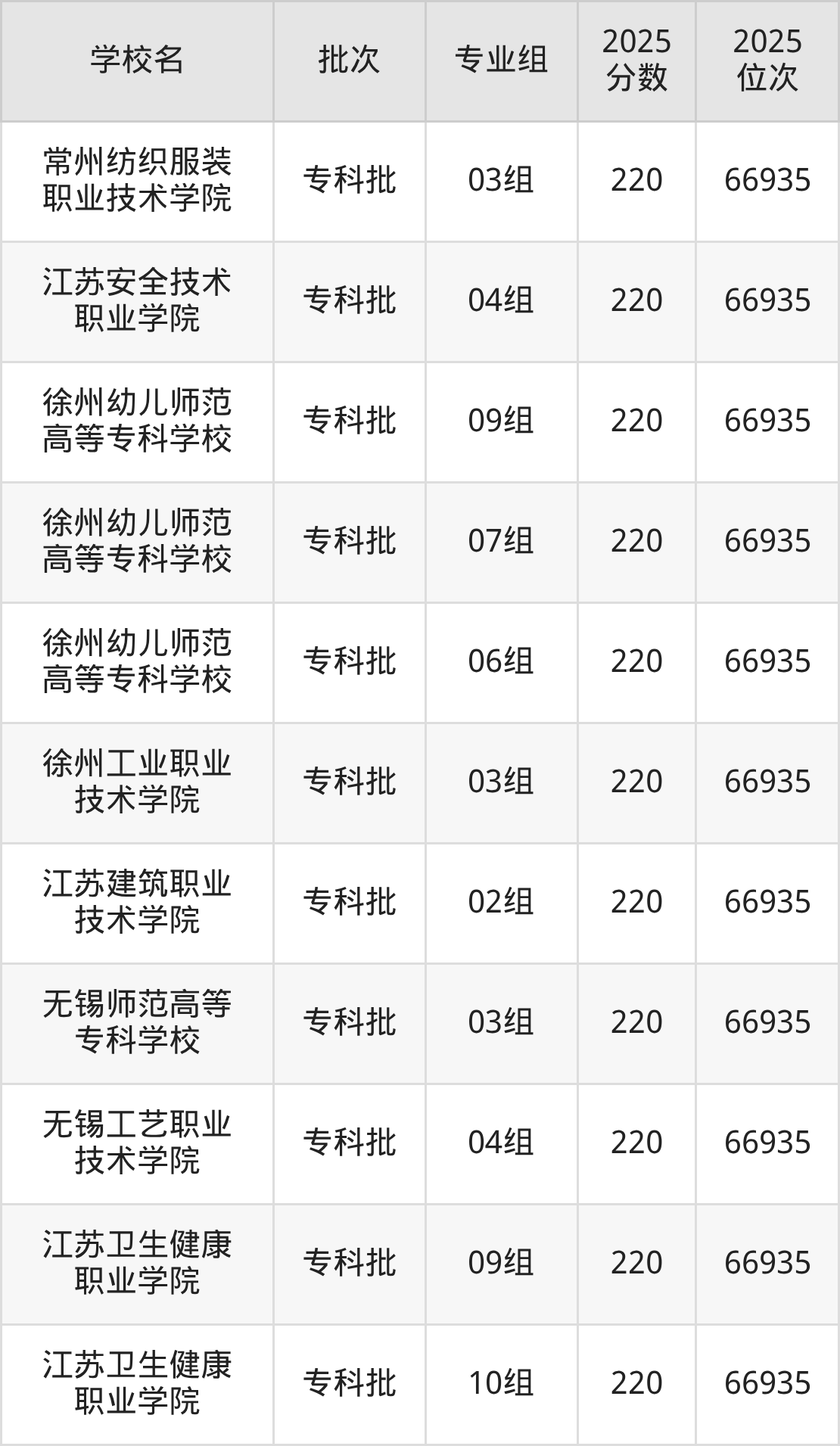 2025年江苏高考物理类232分(66425名~66466名)录取位次低于该区间(较稳妥)的有石家庄城市经济职业学院01组(66514名)、山东文化产业职业学院02组(66599名)等;录取位次高于该区间(可冲)的有徐州幼儿师范高等专科学校08组(66424名)、四川文化产业职业学院02组(66225名)等。