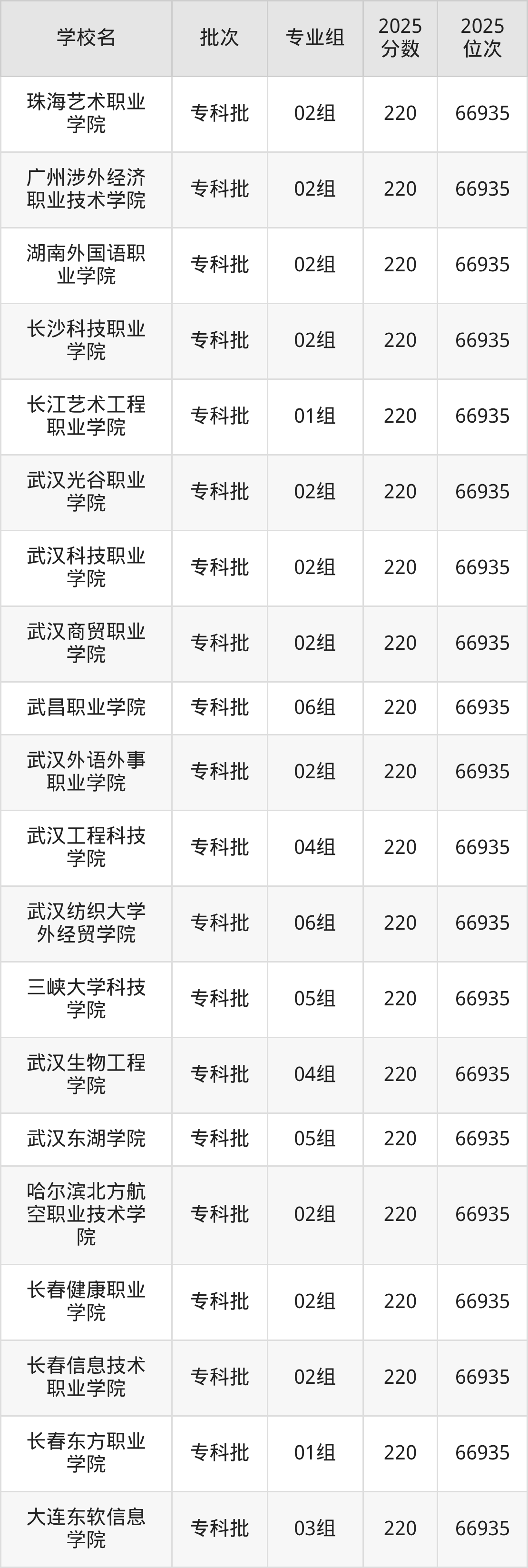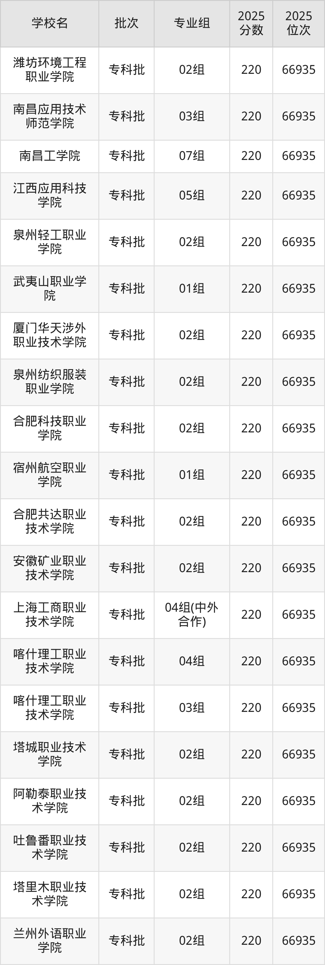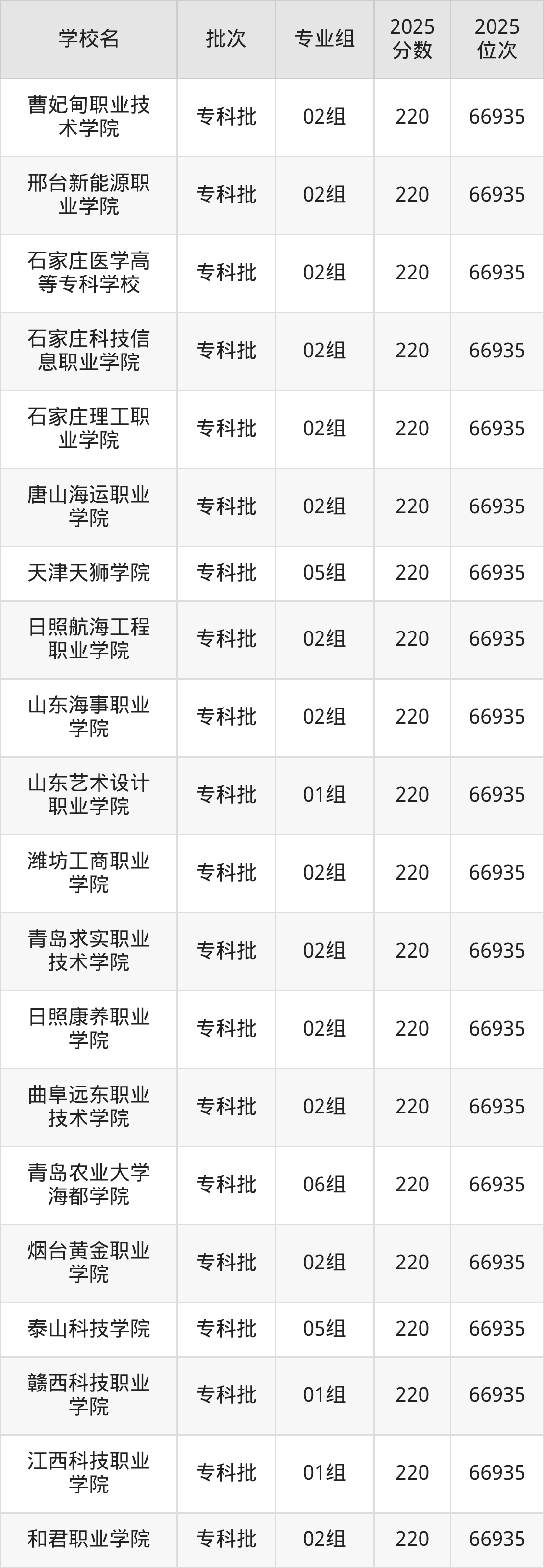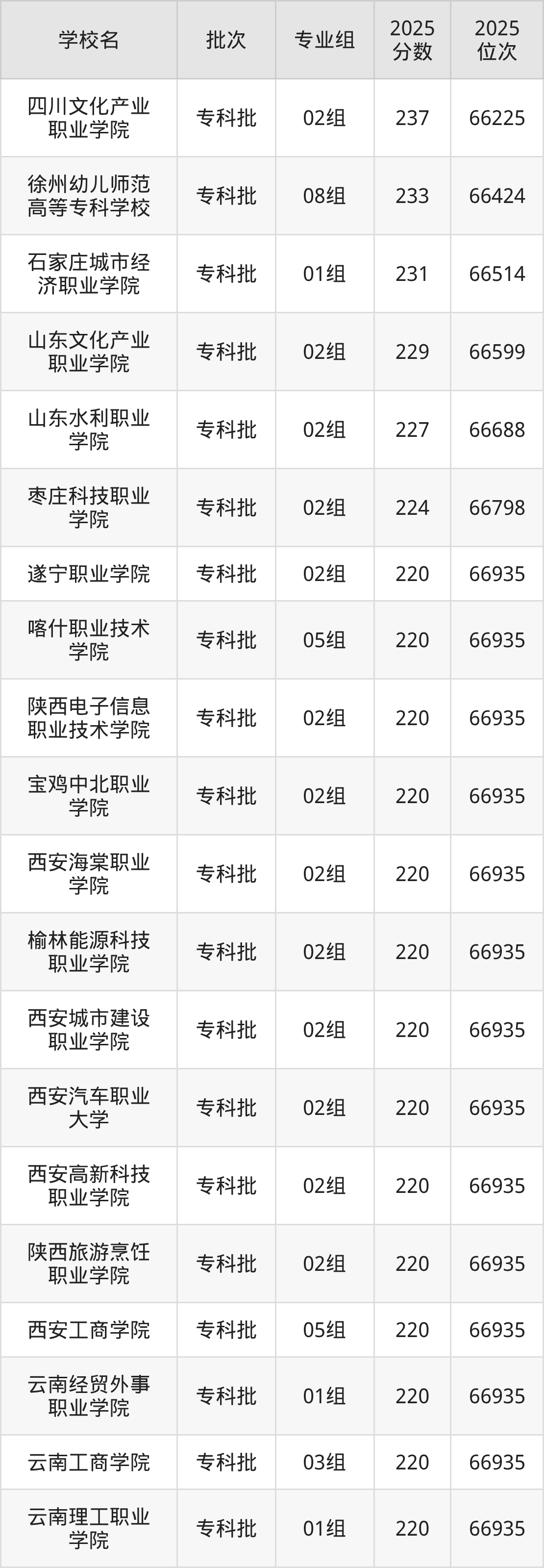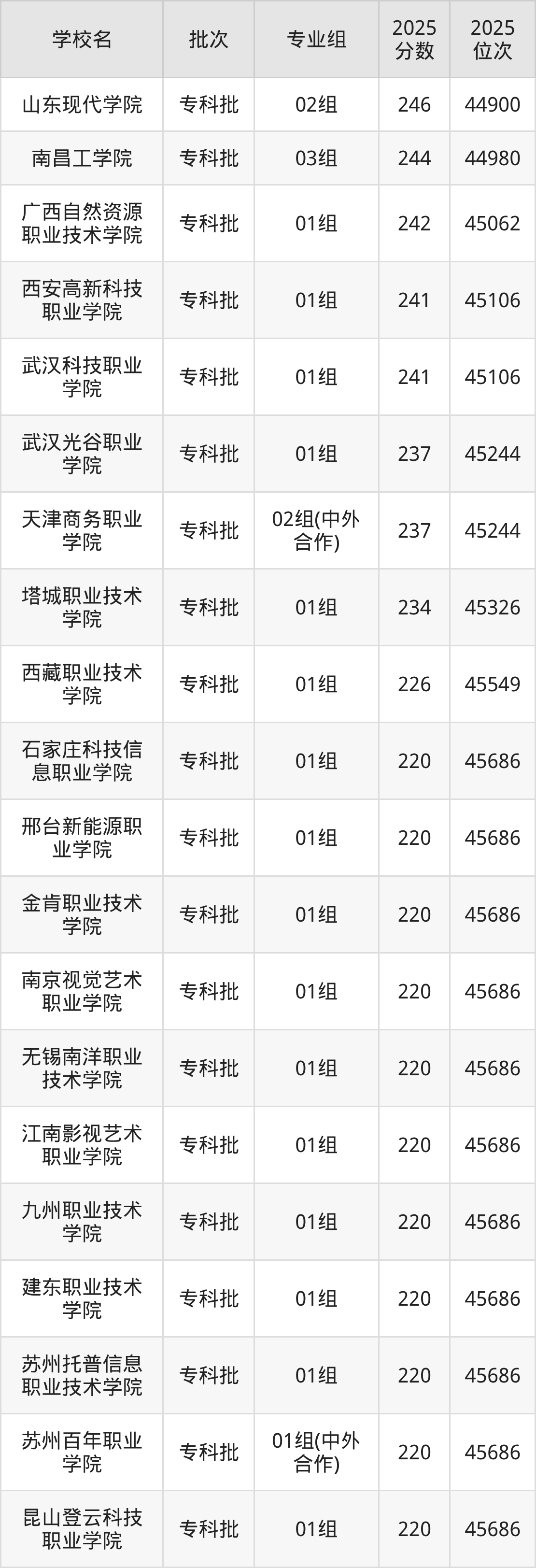 2025年江苏高考物理类232分(66425名~66466名)录取位次低于该区间(较稳妥)的有石家庄城市经济职业学院01组(66514名)、山东文化产业职业学院02组(66599名)等;录取位次高于该区间(可冲)的有徐州幼儿师范高等专科学校08组(66424名)、四川文化产业职业学院02组(66225名)等。