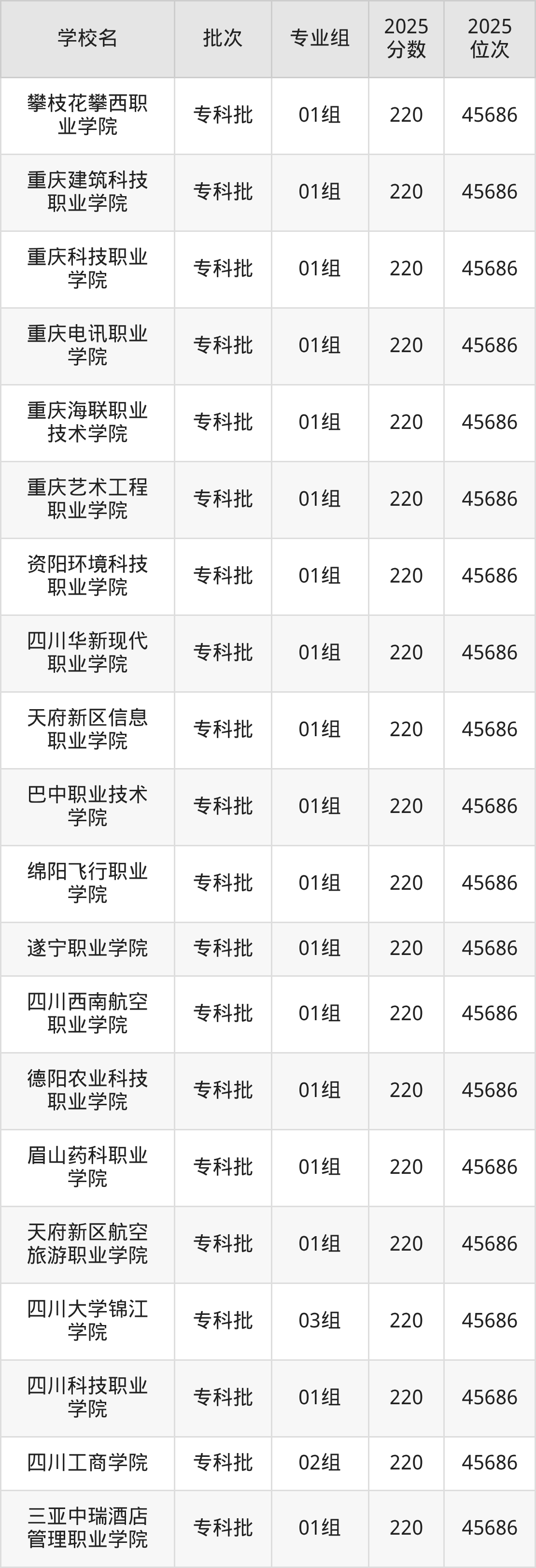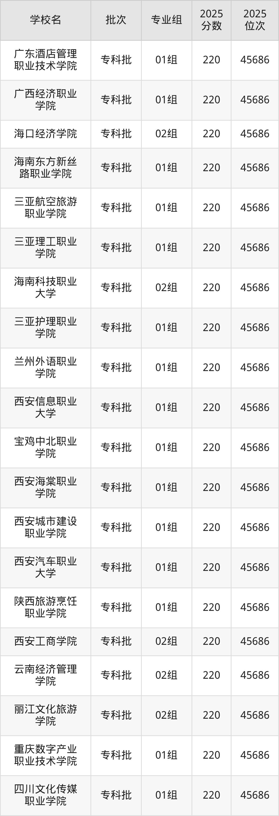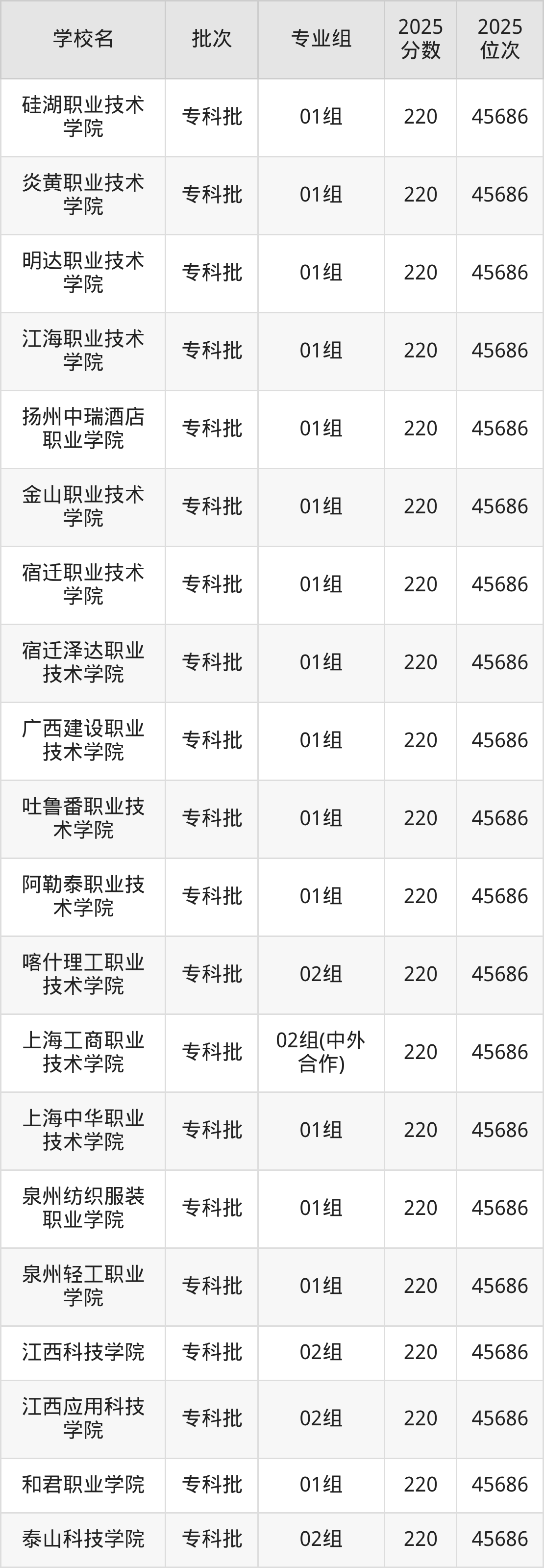 2025年江苏高考历史类232分(45358名~45393名)录取位次低于该区间(较稳妥)的有西藏职业技术学院01组(45549名)、兰州外语职业学院01组(45686名)等;录取位次高于该区间(可冲)的有塔城职业技术学院01组(45326名)、武汉光谷职业学院01组(45244名)等。