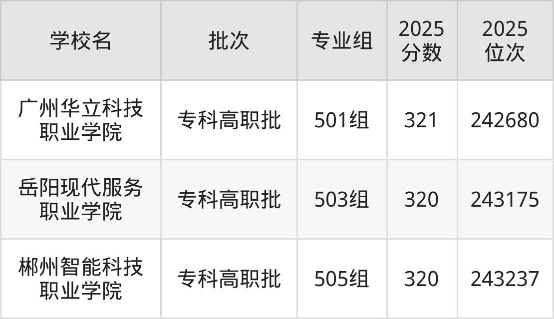 2025年广东高考历史类320分(242816名~243608名)能上的大学有岳阳现代服务职业学院503组、郴州智能科技职业学院505组。