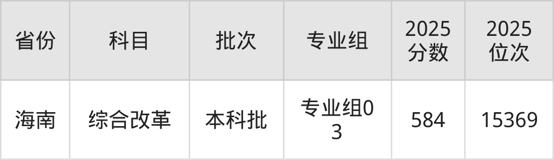 最低录取分数线是584分,对应位次是15369名,招生地区为海南。