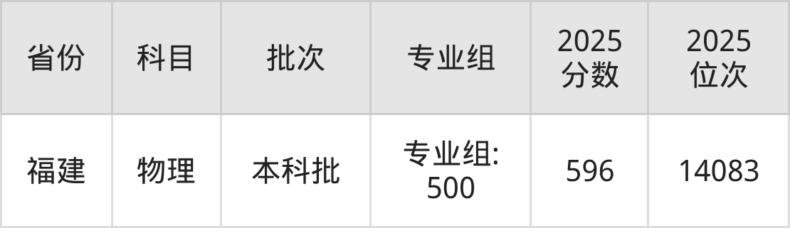 最低录取分数线是596分,对应位次是14083名,招生地区为福建。