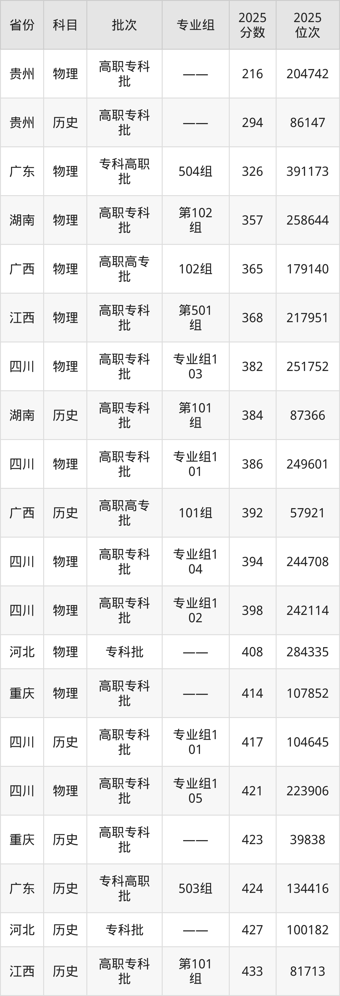 2025年贵州健康职业学院在各省普通批录取分数线一览表: