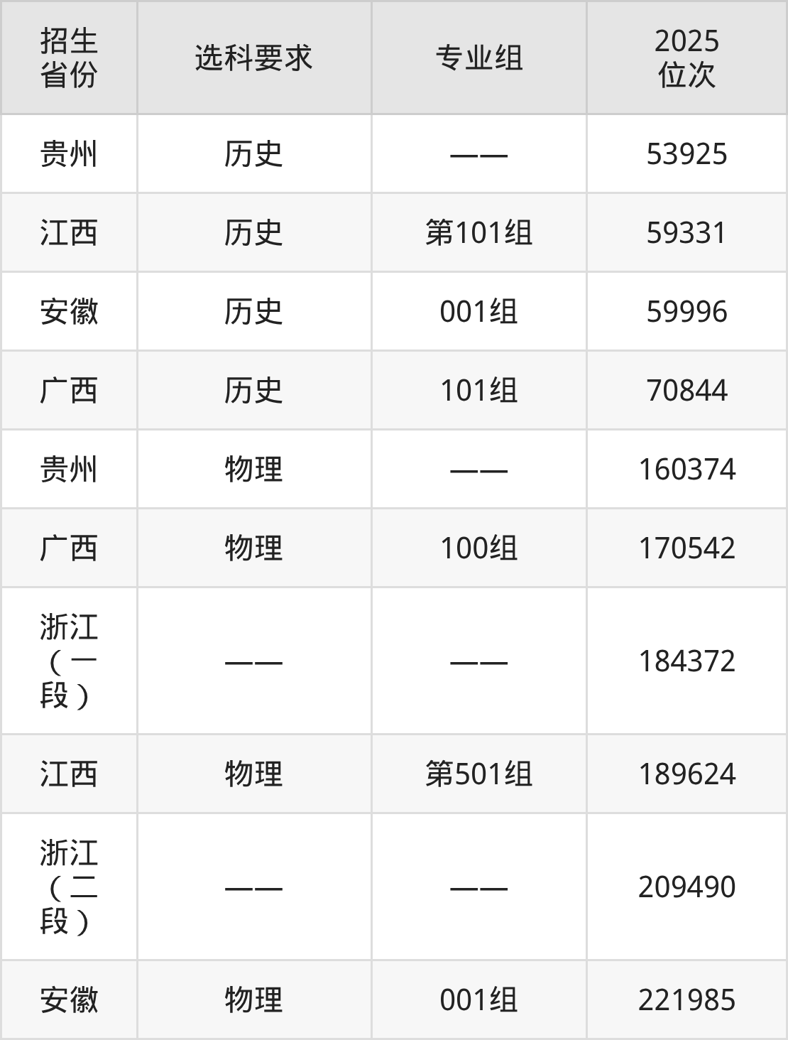 浙江工业职业技术学院2025年在全国各省的位次差异较大,最高位次是53925位(贵州历史类)、最低位次是221985位(安徽物理类)。各省具体位次请看下图: