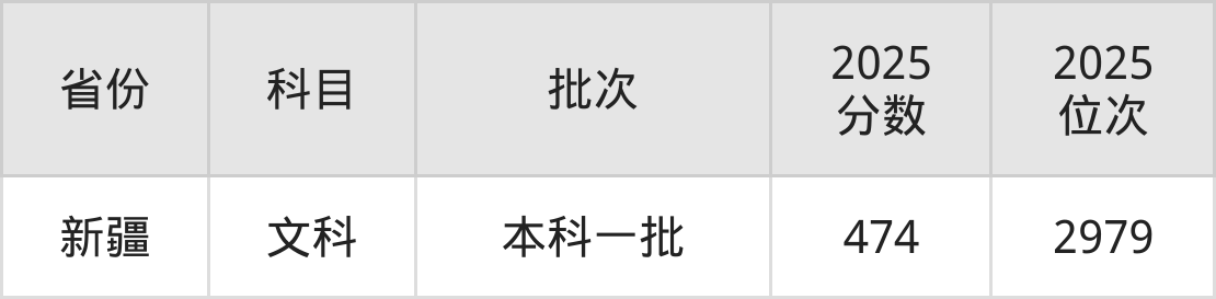 最低录取分数线是474分,对应位次是2979名,招生地区为新疆。
