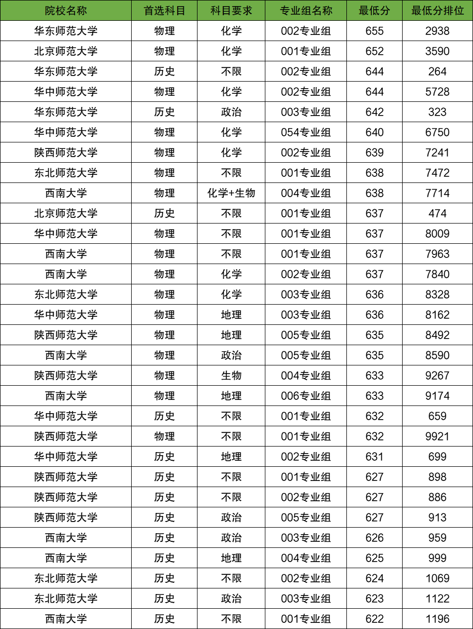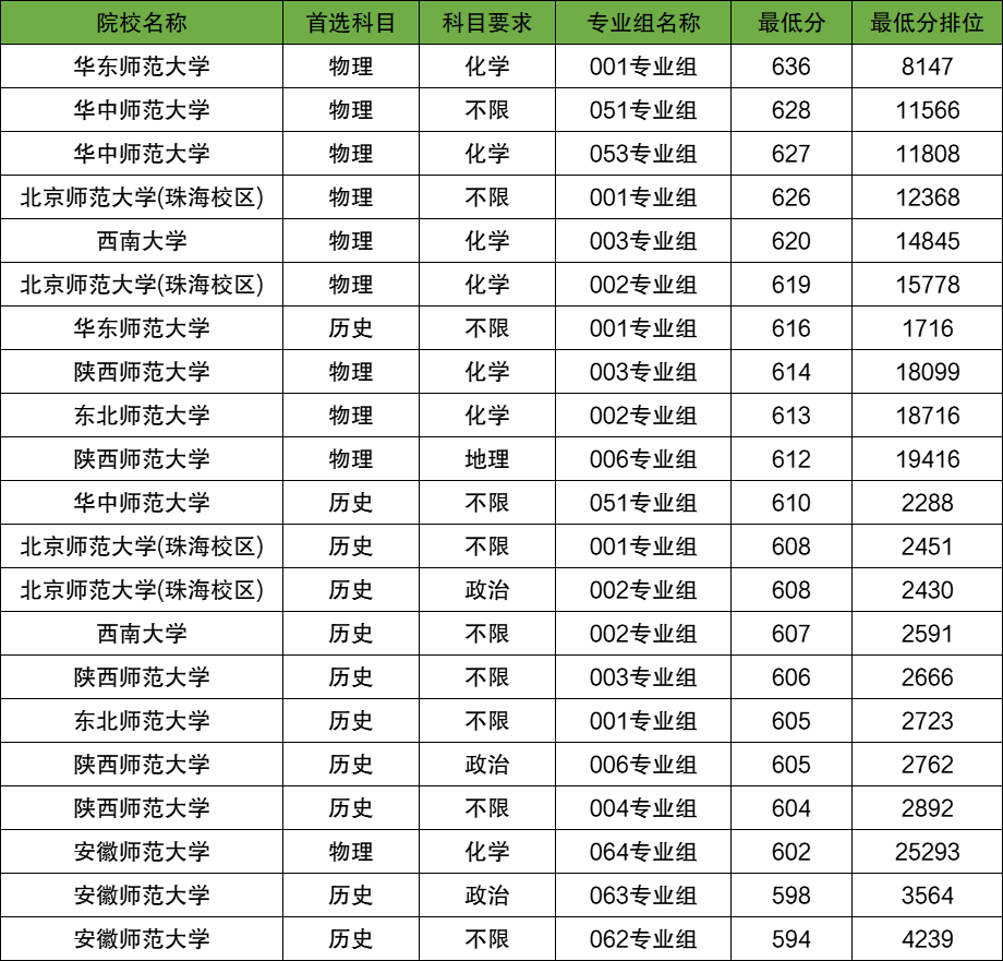 2025年安徽国家公费师范生物理类录取分数线在632分-655分之间,录取分数线最高的是华东师范大学002专业组(化学),2025年投档最低分655分;录取分数线最低的是陕西师范大学001专业组(不限),2025年投档最低分632分。