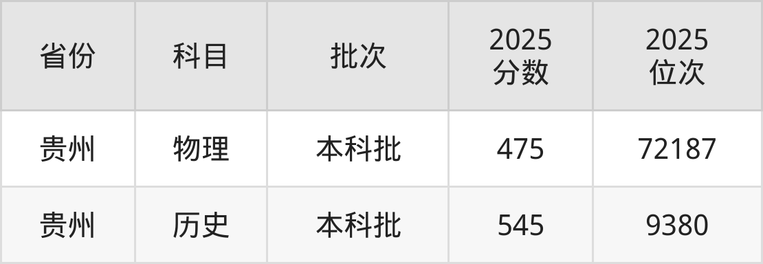 最低录取分数线是475分,对应位次是72187名,招生地区为贵州。