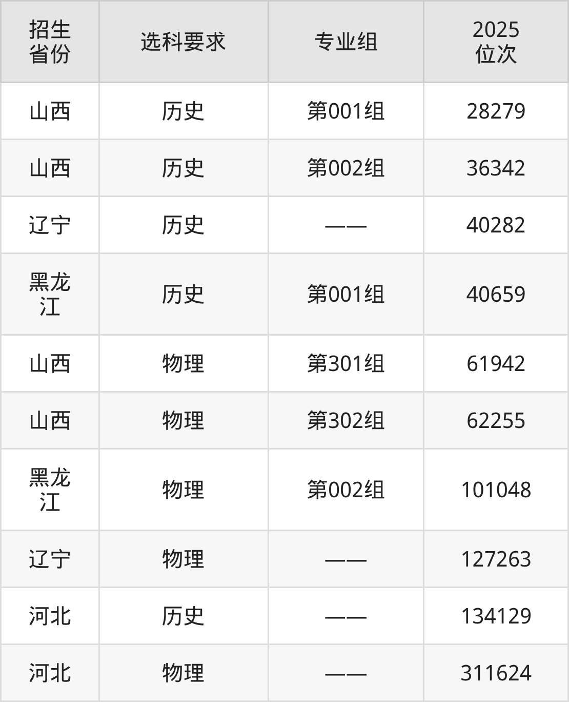 潞安职业技术学院2025年在全国各省的位次差异较大,最高位次是28279位(山西历史类)、最低位次是311624位(河北物理类)。各省具体位次请看下图: