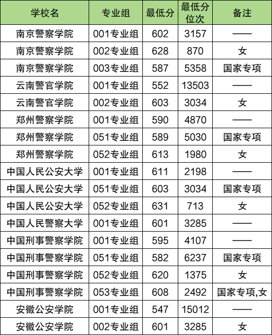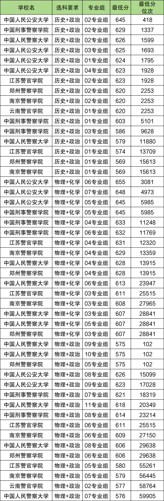 (1)南京警察学院:02专业组623分、01专业组574分、04专业组631分、03专业组611分、06专业组611分、05专业组580分。