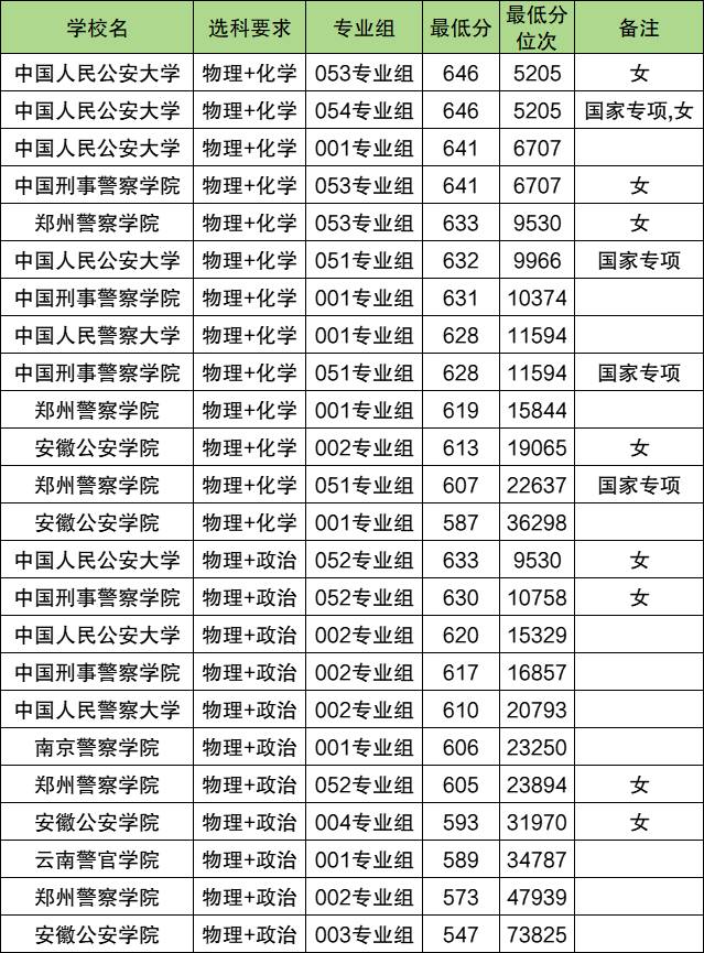 各警校物理类录取最低分数线:郑州警察学院573分、云南警官学院589分、中国人民警察大学610分、中国刑事警察学院617分。