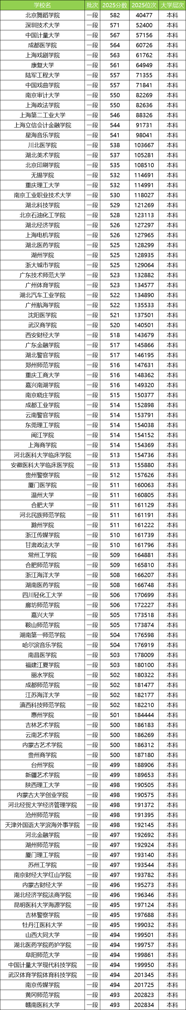 收分最高、最难考的是:北京舞蹈学院,学校2025最低投档分为582分、最低位次为40477名;分数线最低的二本大学为聊城大学东昌学院,2025年二段最低分150分,位次681116名。
