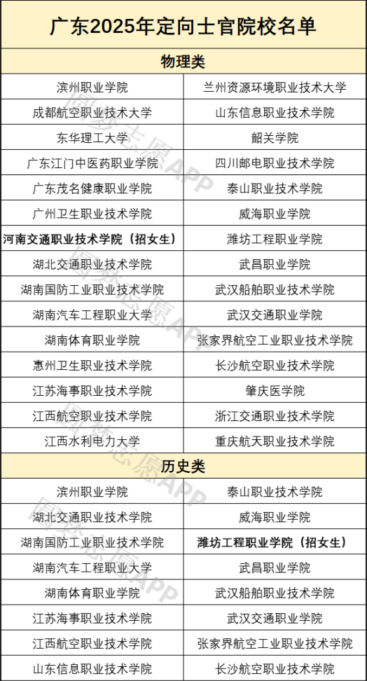 最新一年招生计划显示,定向士官在广东省招生院校中,物理类招生院校30所、历史类招生院校16所,不同院校招生人数、专业、类型等都有差异,为方便2026届考生报考,下面将详细列举这些学校的名单,供查阅: