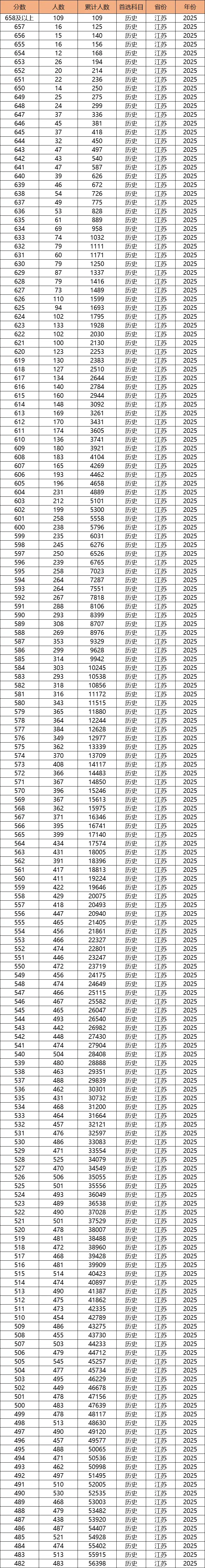 江苏省2025年历史组一分一段表: