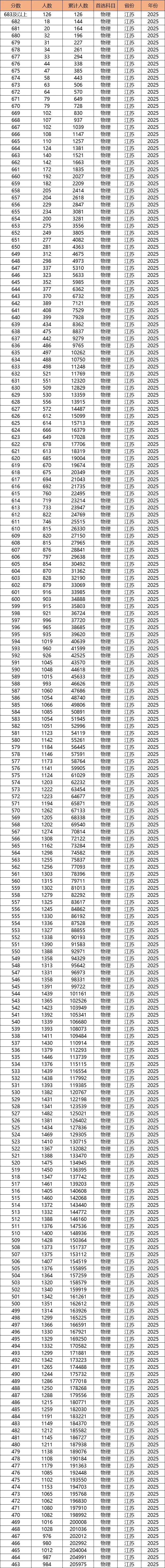 江苏省2025年物理组一分一段表: