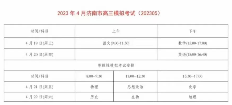 2023济南二模将在4月19日-22日举行,一共考四天,此次的考试科目共有9门,即语文、数学、英语、政治、历史、地理、物理、化学、生物。对于此次的考试成绩,同学们要认真总结、查漏补缺,为后期的复习做好铺垫!