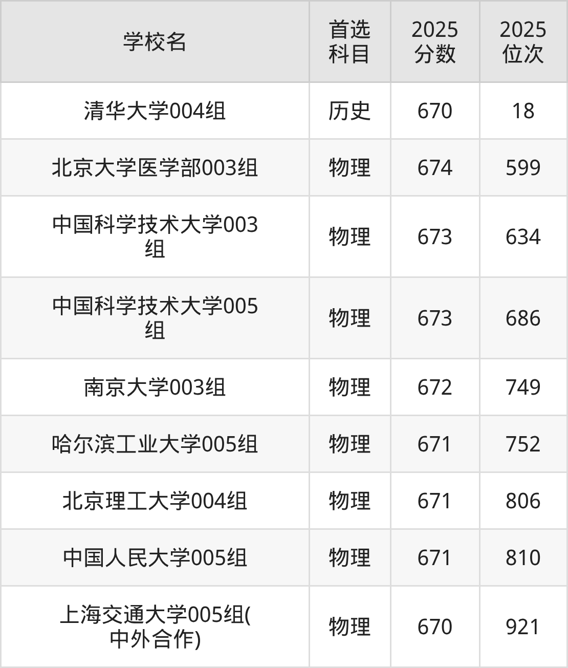 | 清华大学第10组(国家 专项) | 物理 | 672 | 302 |