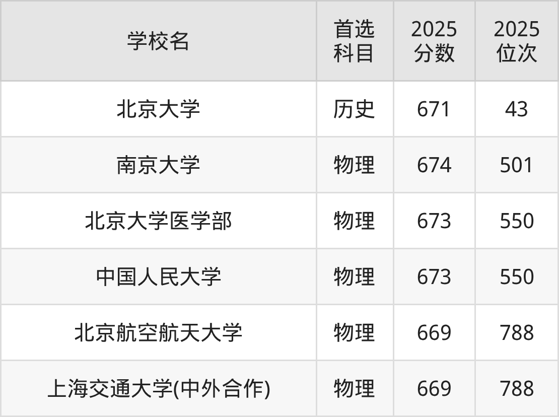 | 学校名 | 首选 科目 | 2025 分数 | 2025 位次 |