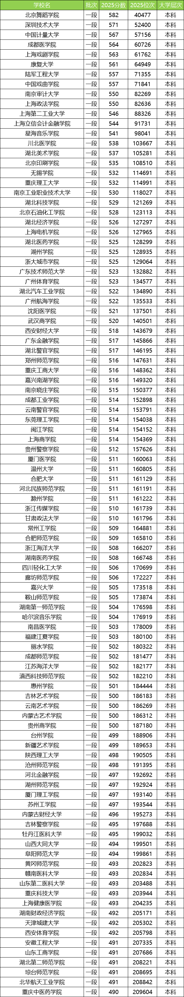 2025年全国公办二本大学录取分数线排名榜单一览表: