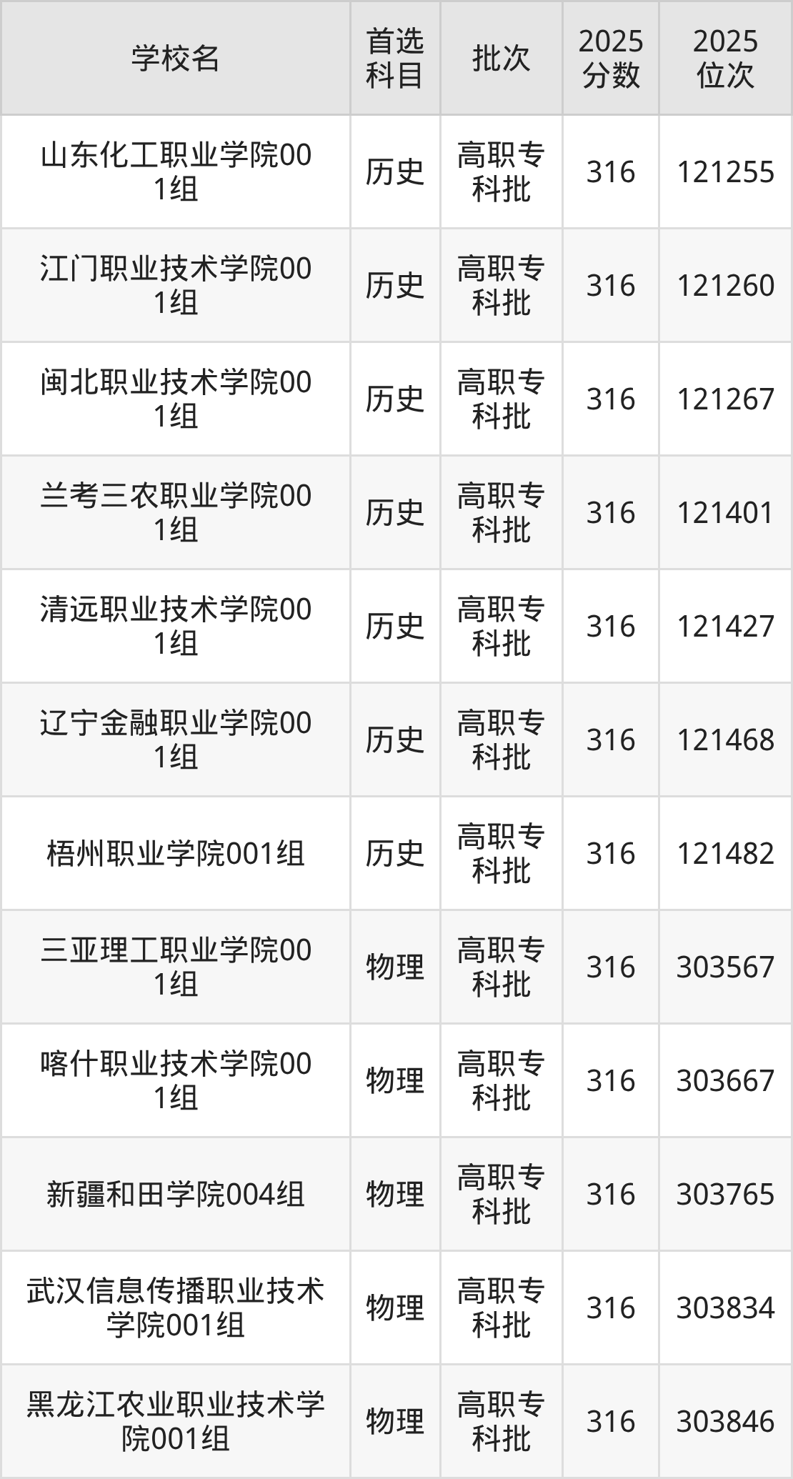 历史类316分能上的有山东化工职业学院、江门职业技术学院、闽北职业技术学院、兰考三农职业学院、清远职业技术学院等;物理类316分能上的有三亚理工职业学院、喀什职业技术学院、新疆和田学院、武汉信息传播职业技术学院、黑龙江农业职业技术学院等。